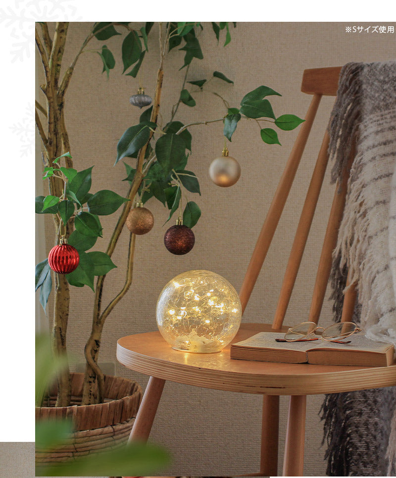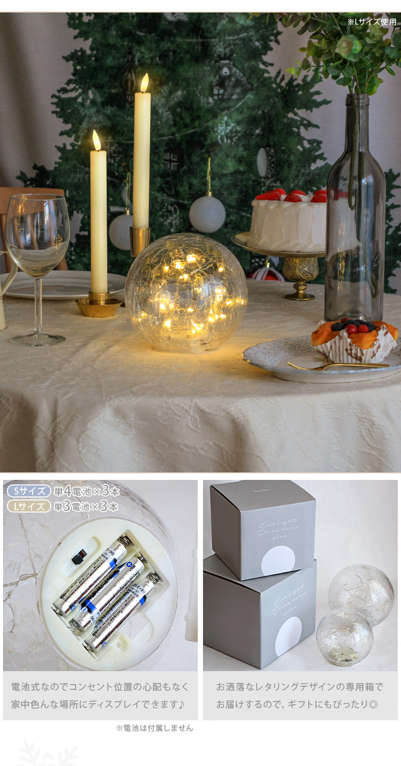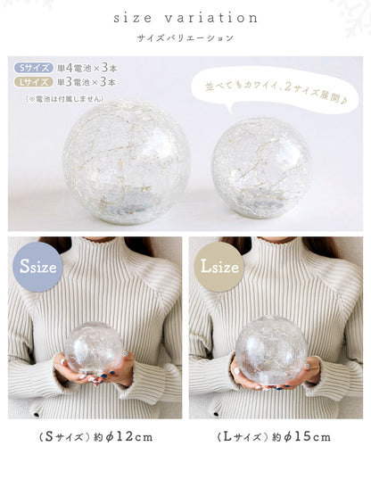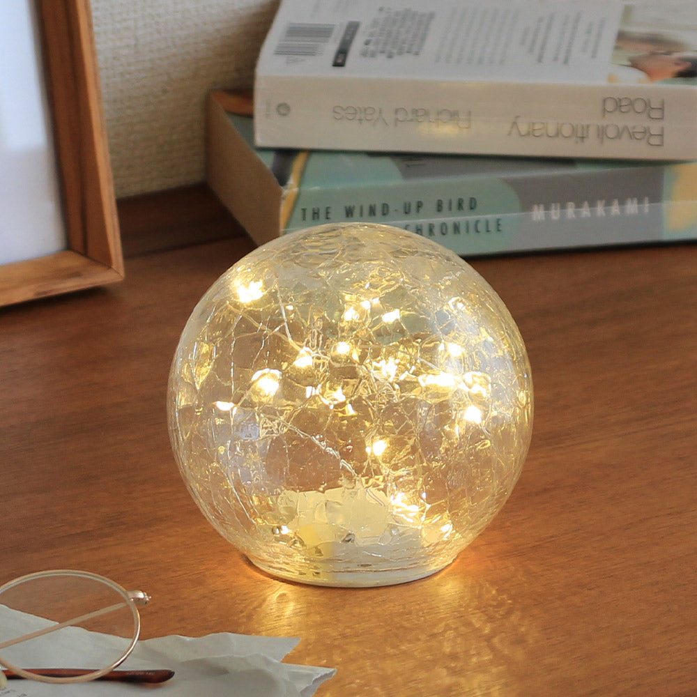 ころんとしたドームガラスの中に小さなLEDライトを閉じ込めた、ロマンチックなオブジェライト。クリスマスなどのイベント飾りとしてはもちろん、普段使いの間接照明としても楽しめる一品です♪クラック(ひび割れ)加工を施したガラスは、まるで氷河に浮かぶ割れた氷のような質感。ハンドメイドで作られた唯一無二のクラック模様を楽しめます。ガラス内部の小粒ライトを灯すと、クラック加工によってできたガラス表面の凹凸に無数の光反射を生み出し、神秘的な陰影が浮かび上がります。お届けの際はレタリングデザインのお洒落なパッケージに入っているので、大切な人へ贈るギフトにもぴったりです♪