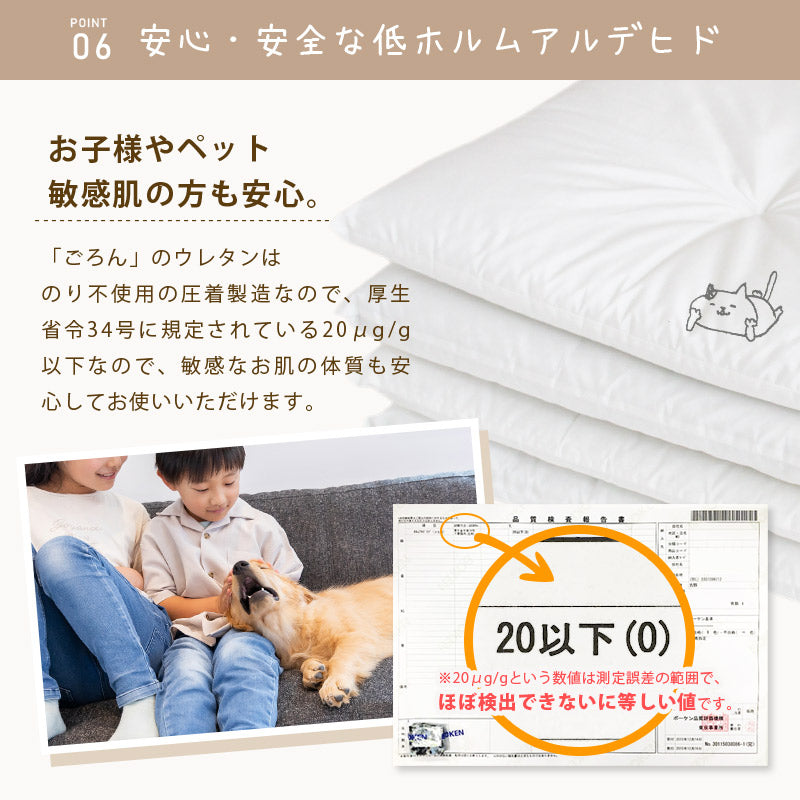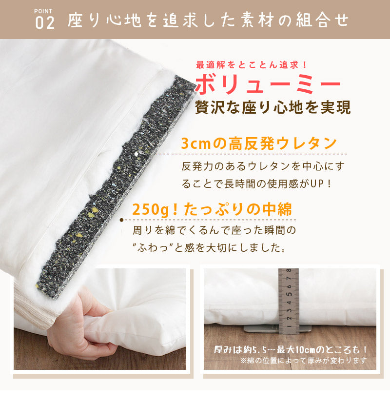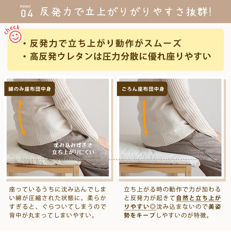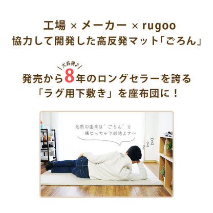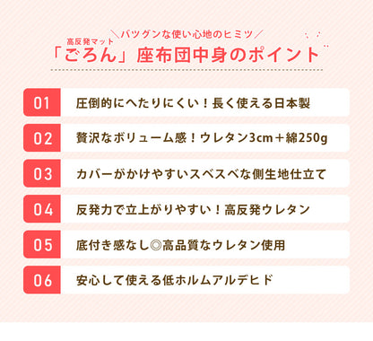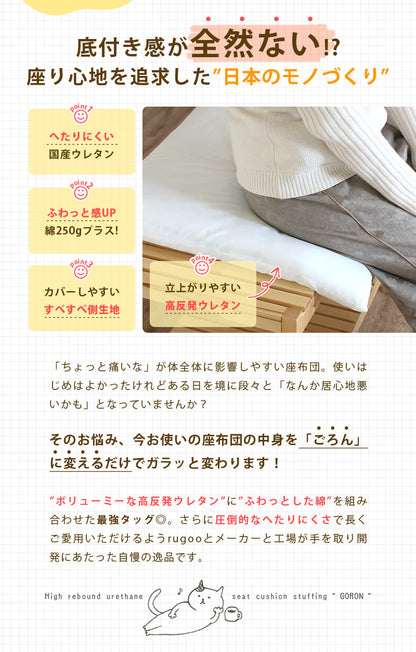 ラグの下に敷いて気持ちいい高反発ウレタンにこだわって開発したらぐーの「ごろん」というアイテムから”座布団の中身”を作りました!元々ラグ用下敷きマットとして開発した「ごろん」の使い心地のよさは折り紙付き。それをもっと身近で活用できないかという想いで制作に至ったこちらの座布団の中身はなによりも座り心地を追求して試行錯誤しながら開発しました。はじめのふわっとした座り心地を感じられる中綿のバランス、長時間座っていても疲れにくく立ち上がりやすい「ごろん」の高反発ウレタンの厚み、スルッとカバーがかけやすい側生地など、企画者も生産者も妥協せずつくりあげた自慢の逸品です。