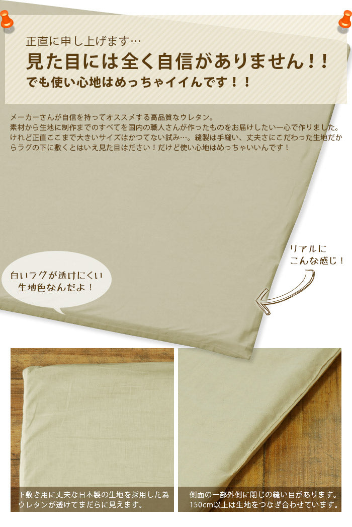 | ご注意 | ■側地に綿布を使用しておりますので、フローリングや滑りやすい床材の上では別途滑り止めのご使用をおすすめします。 ■下敷き高反発マット《単品》のみとなります。※ラグは付属しません。 ■使用しているウレタンの特性上、水分量によってサイズが-3~7cm程度縮む場合がございます。 ■使用状況や使用時間によってへたり具合は異なります。 |
