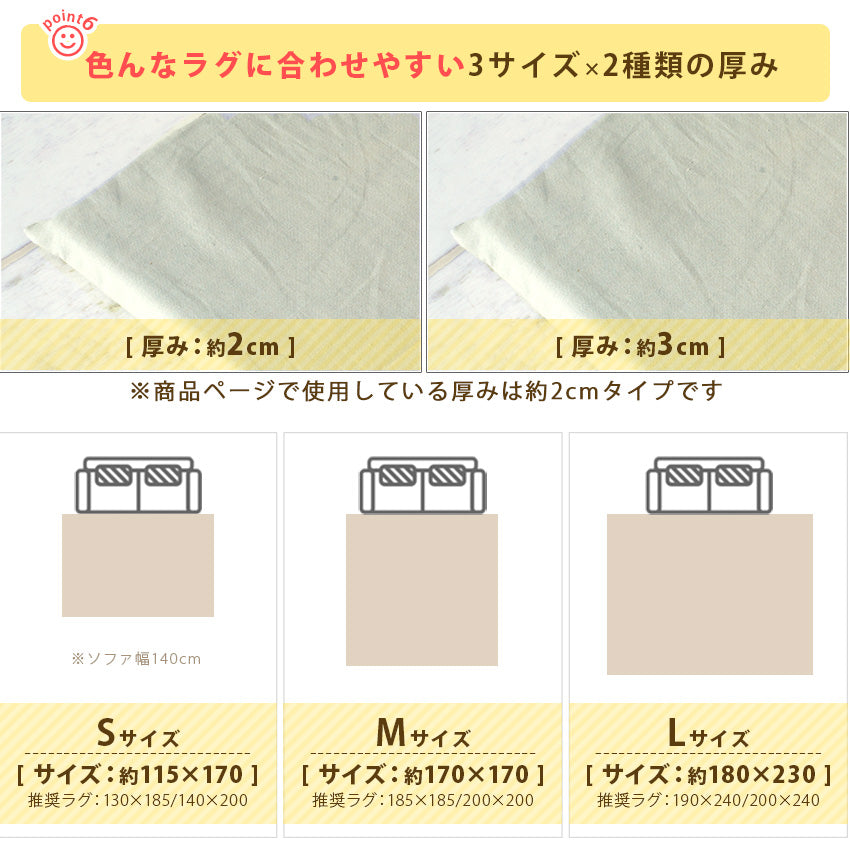 | サイズ | 約115×170cm(約1.5畳) 約170×170cm(約2畳) 約180×230cm(約3畳) |