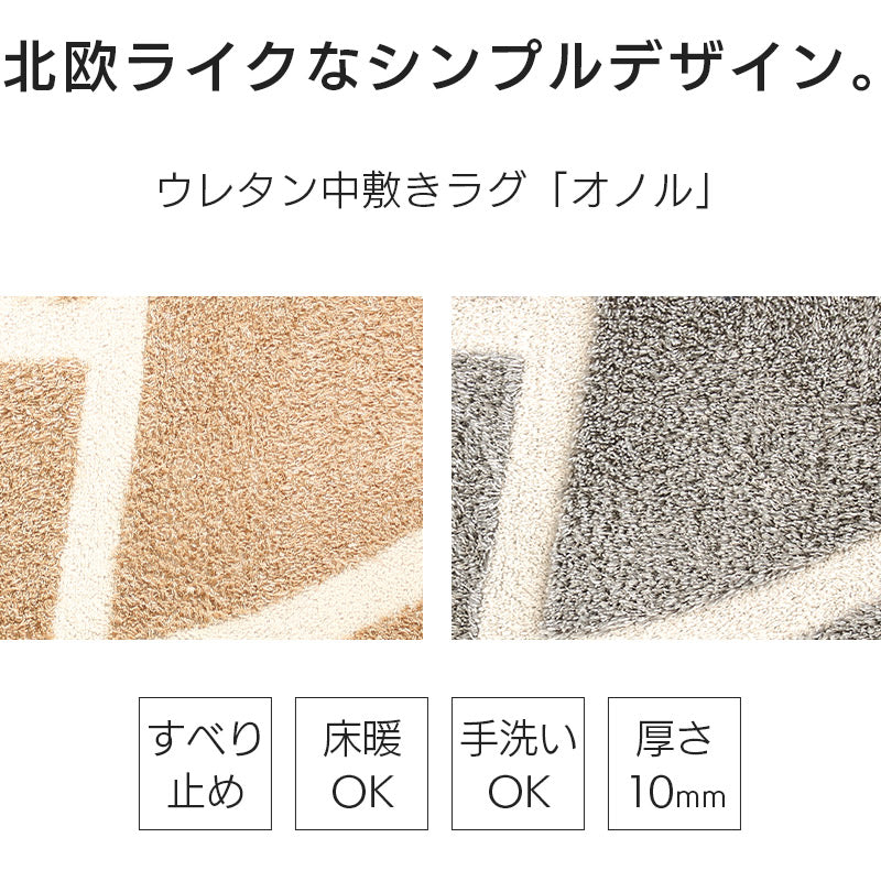 北欧ナチュラルなシンプルデザインのウレタンラグ♪10mmのほどよい厚みのウレタンフォームでふっかふか!端はパイピング処理がされほつれにくくなっています。毛足が短いので食べこぼしや髪・ホコリなどのゴミが絡まず掃除機やコロコロがけがラクラク!うっかり汚してしまってもご家庭で手洗いができるのでお子様やペットのいるご家庭にもピッタリ!お手入れがめんどくさくないので普段使いに◎床暖房&ホットカーペットにも対応しているのでオールシーズン快適にお使いいただけます。