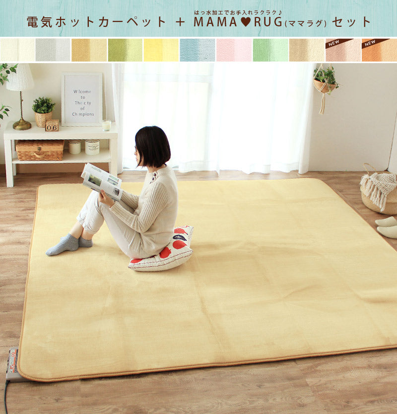 床からの冷気をカットして暖房効率をアップしてくれるホットカーペットと当店オリジナル「はっ水ママラグ」がセットになって登場。届いてすぐ使えるからとっても便利♪