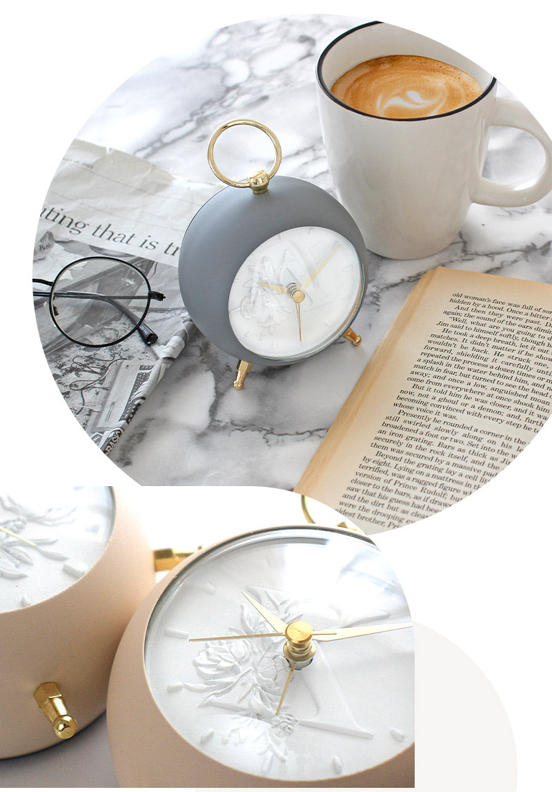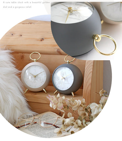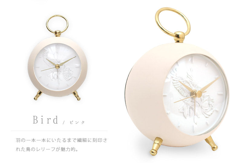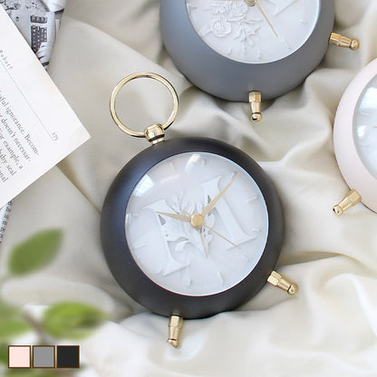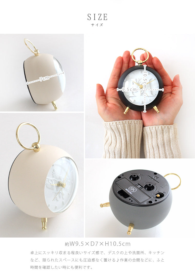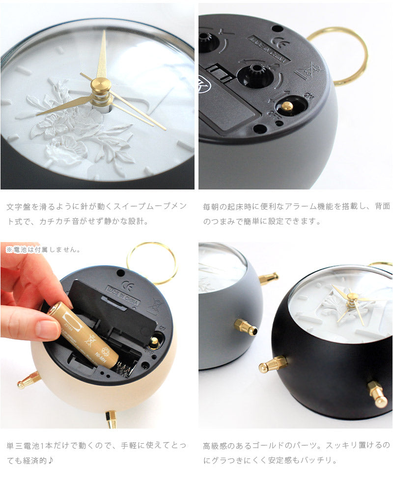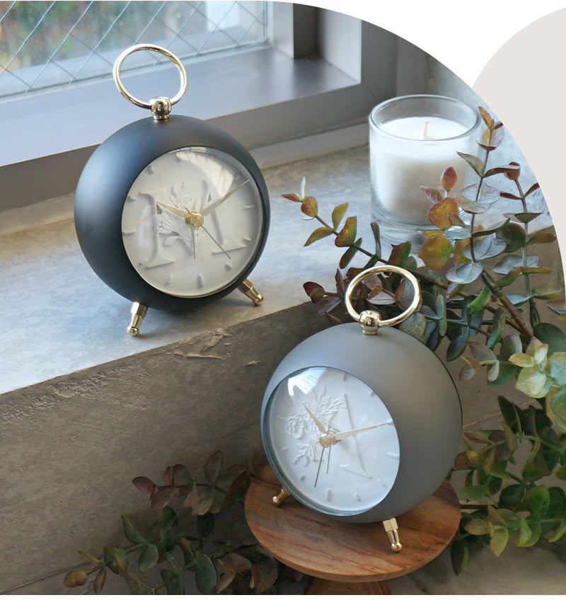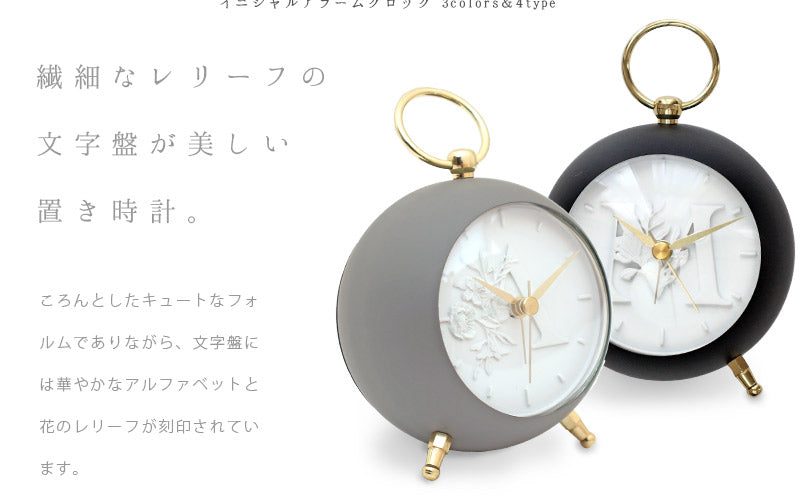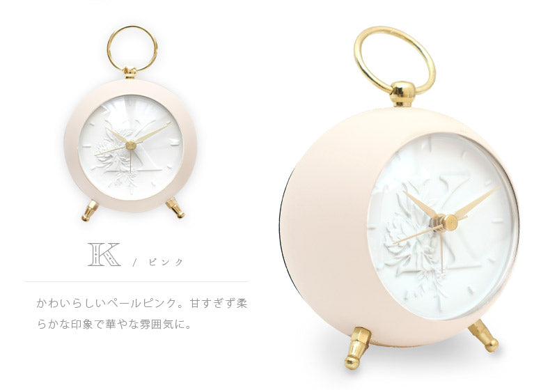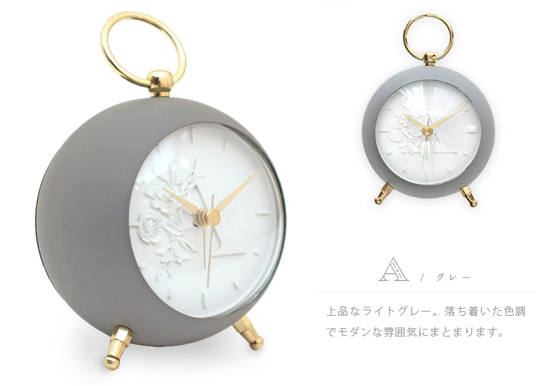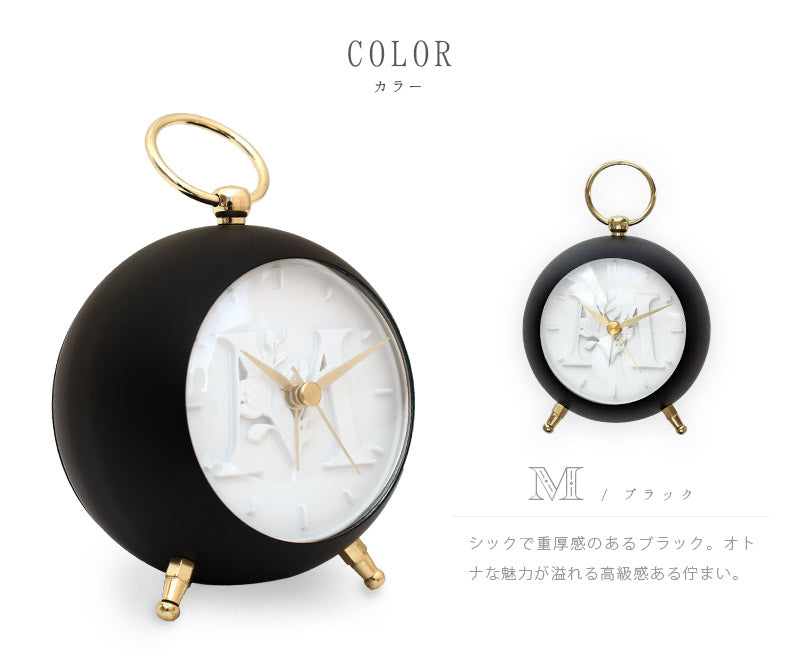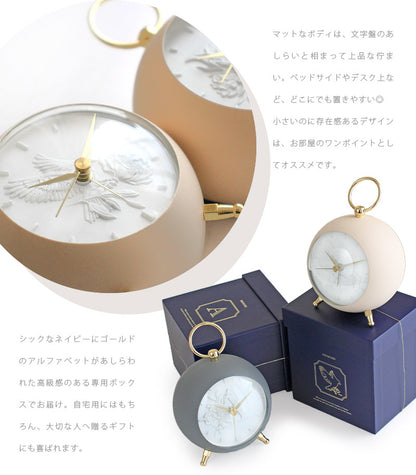 ころんとしたキュートなフォルムでありながら、文字盤には華やかなアルファベットと花のレリーフが刻印されています。マットなボディは、文字盤のあしらいと相まって上品な佇まい。ベッドサイドやデスク上など、どこにでも置きやすい◎小さいのに存在感あるデザインは、お部屋のワンポイントとしてオススメです。高級感のある専用パッケージでお届けするので、ご自宅用にはもちろん、大切な人へ贈るちょっとしたギフトにも喜ばれます。