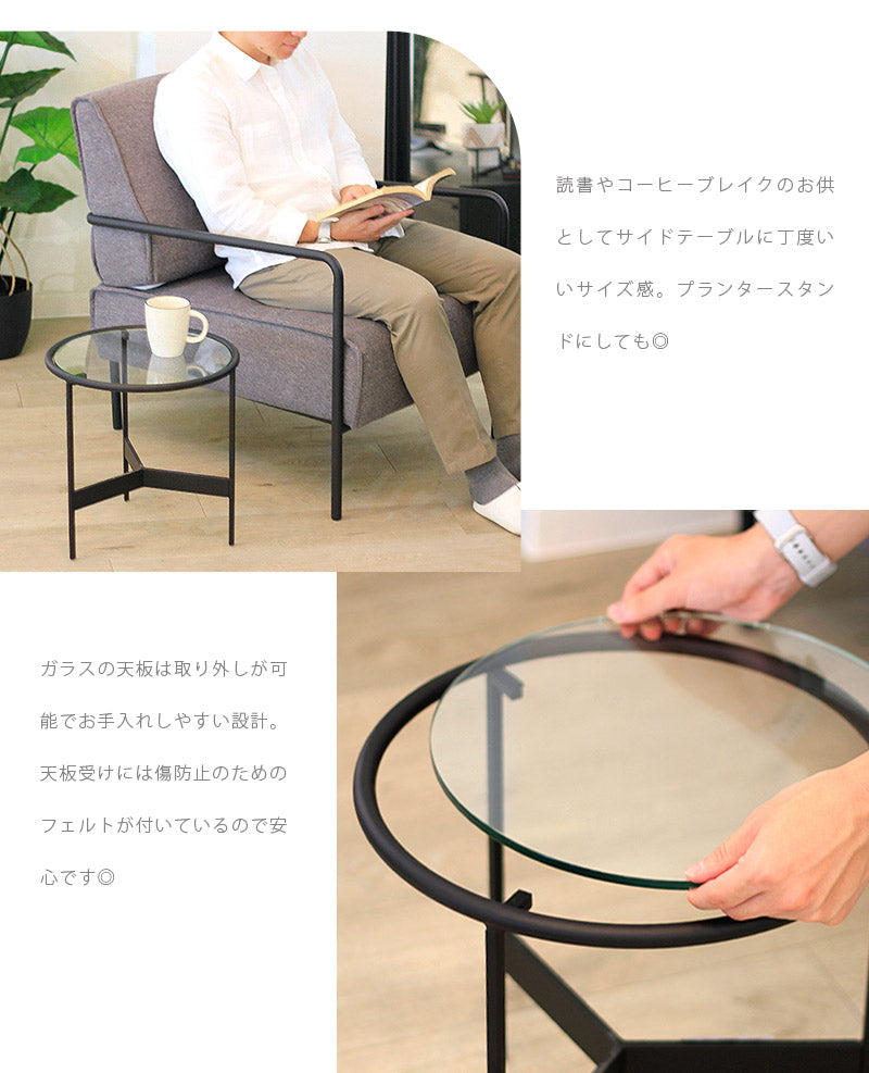 シンプル&スタイリッシュなミニテーブル。開放感のある透明なガラス天板をブラックアイアンのフレームでかたどることで、ミニマルでありながら在感のある佇まいで空間を引き締めてくれます。読書やコーヒーブレイクのお供としてサイドテーブルに丁度いいサイズ感。プランタースタンドにしても◎ガラスの天板は取り外しが可能でお手入れしやすい設計。天板受けには傷防止のためのフェルトが付いているので安心です◎ 完成品なので届いてすぐ飾れます。