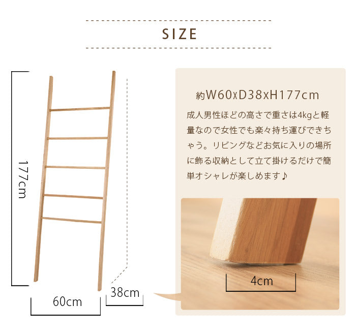 | 備考 | ●荷物到着後付属の六角レンチで組み立ててください、完成品でのお届けではありません。 ●過度に重いものや、はしご部分に人が登らないようにしてください。 ●天然木を使用しているため一つ一つ、違いがあります。木目や節等は 木の表情としてご理解の上、お買い求めください。 |