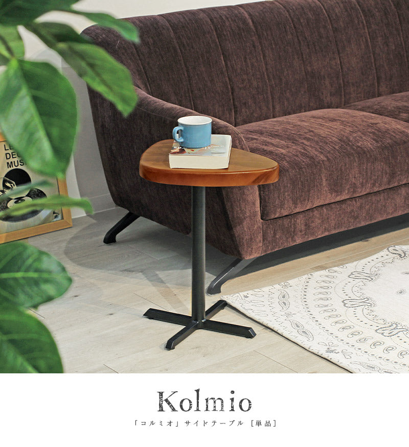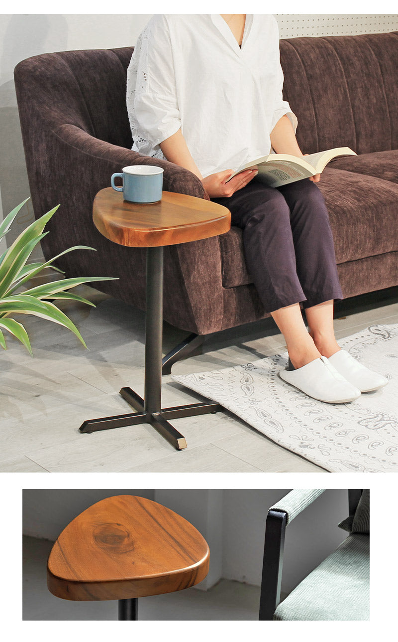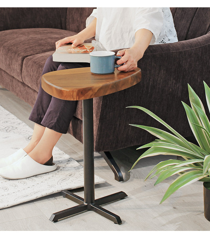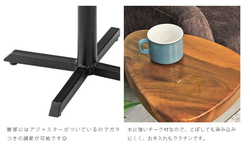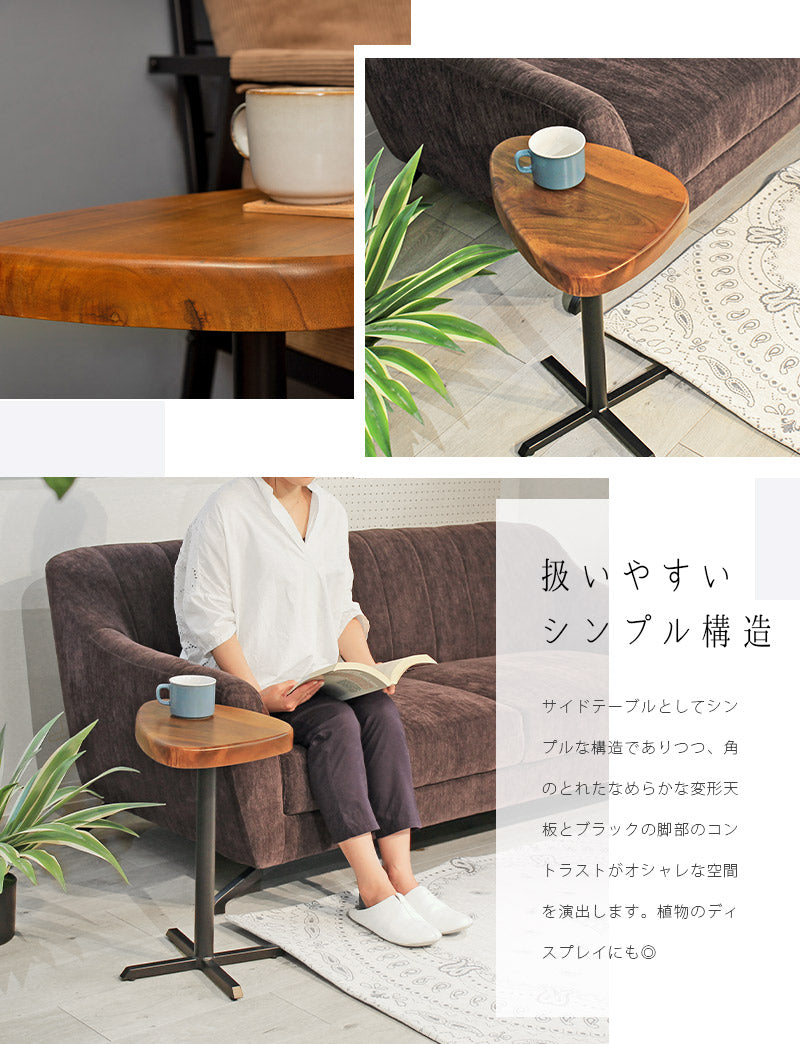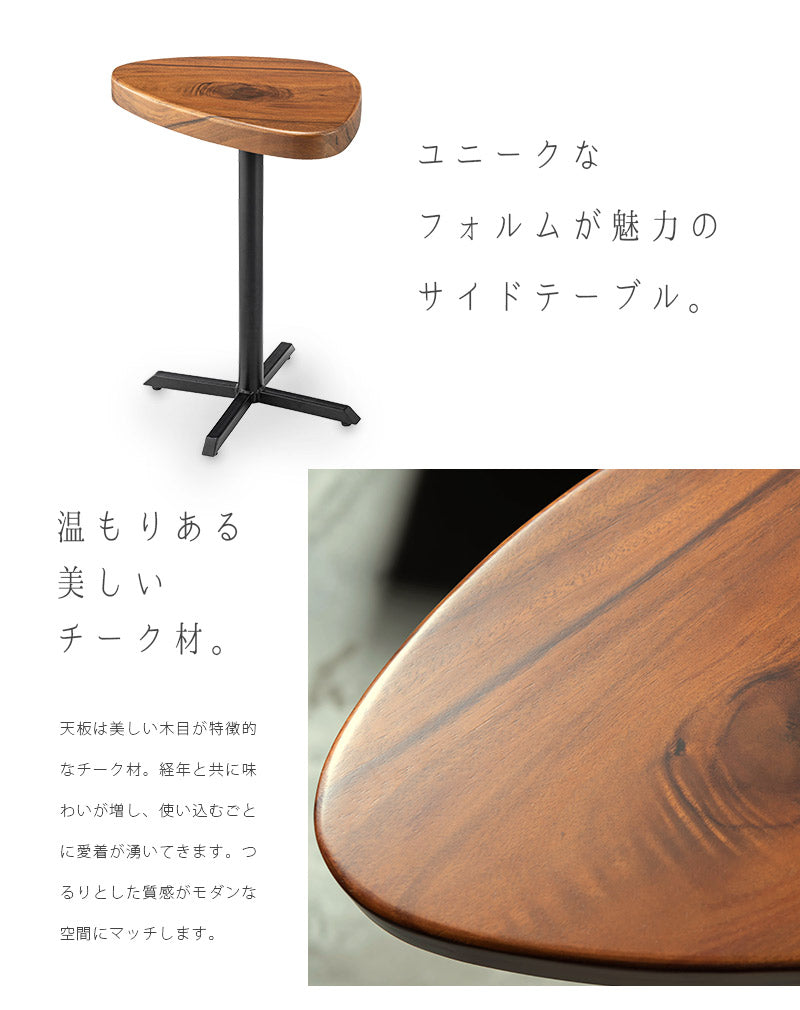 空間のアクセントになる変形デザインのサイドテーブル。天板は美しい木目が特徴的なチーク材で経年と共に味わいが増し、使い込むごとに愛着が湧いてきます。つるりとした質感がモダンな雰囲気にマッチします。サイドテーブルとしてシンプルな構造でありつつ、角のとれたなめらかな変形天板とブラックの脚部のコントラストがオシャレな空間を演出します。植物のディスプレイにもピッタリ◎脚部にはアジャスターがついているのでガタつきの調節が可能です。