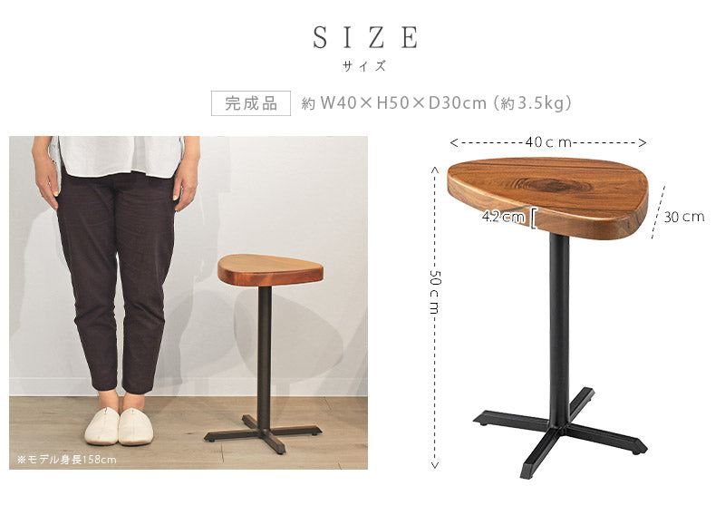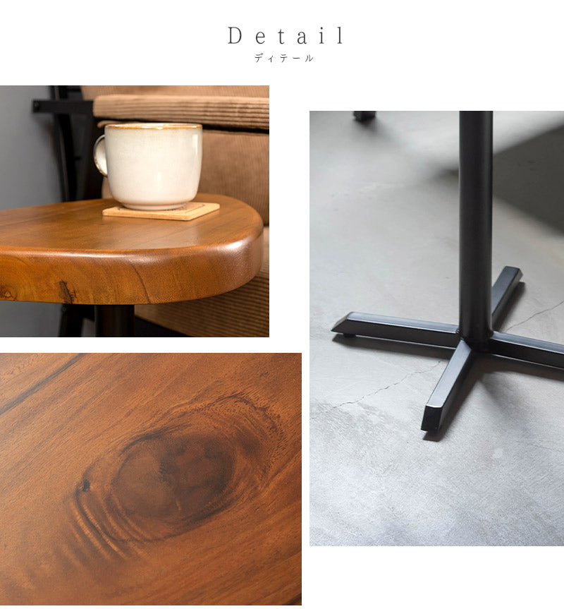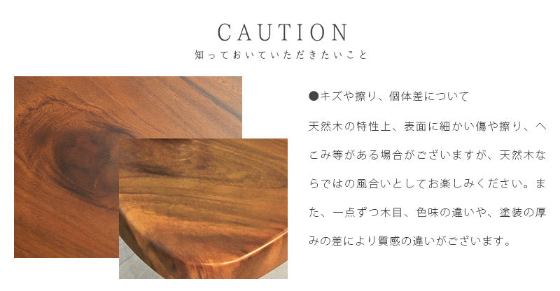| 注意事項 | ●天然木の特性により個体差があります。 ●脚部の材料に古材を使用しておりますので、木部の穴や傷、亀裂などは本製品の特性としてご理解ください。 ●平坦な場所に安定させた状態で使用してください。 ●立ち座りの際に天板に手を付いたり、重量のある物を偏って置いたりする等の偏荷重を掛けた場合、テーブルが傾いたり転倒する場合がございます。 |
