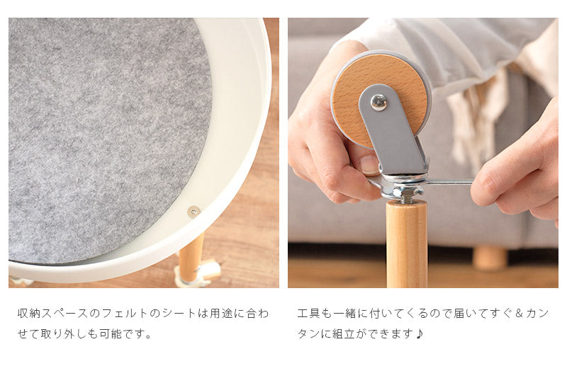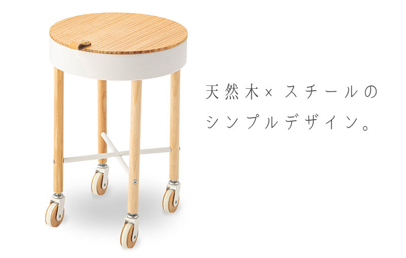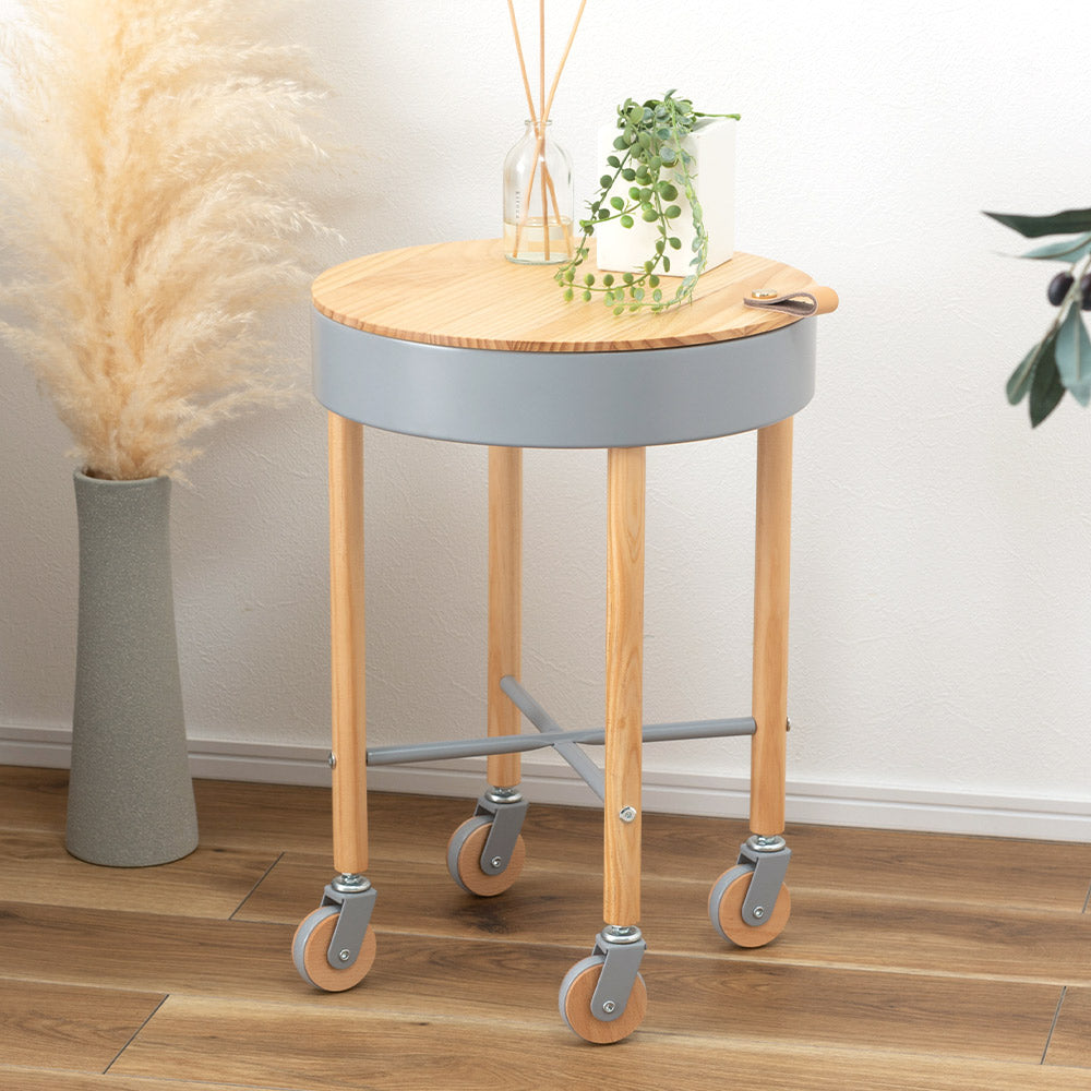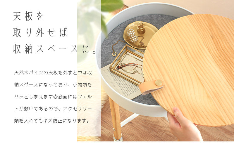天然木とスチールのシンプルなデザインの北欧チックなかわいらしいサイドテーブル。天然木パインの天板を外すと中は収納スペースになっており、小物類をサッとしまえます◎底面にはフェルトが敷いてあるので、アクセサリー類を入れてもキズ防止になります。片手でサッと動かせるキャスターがついているので、読書やティータイム中にも扱いやすいポジションへ楽に移動させることができます◎ソファやベッドサイドはもちろん様々なシーンで活躍してくれます。