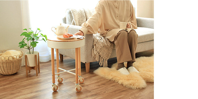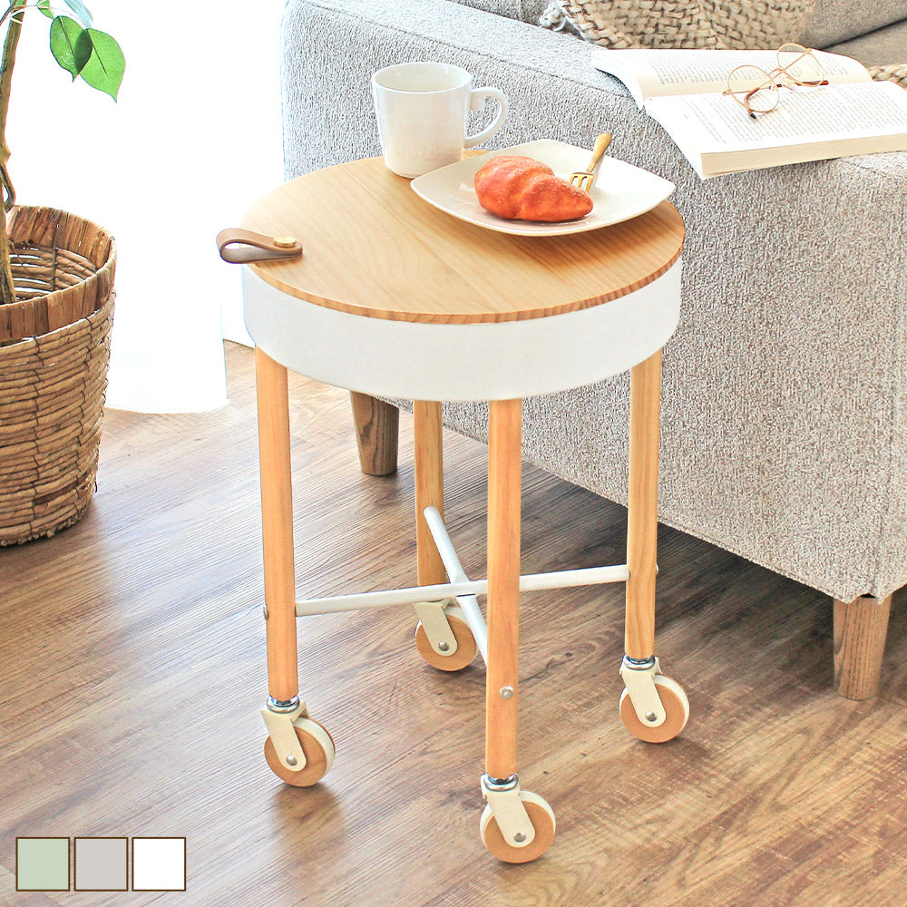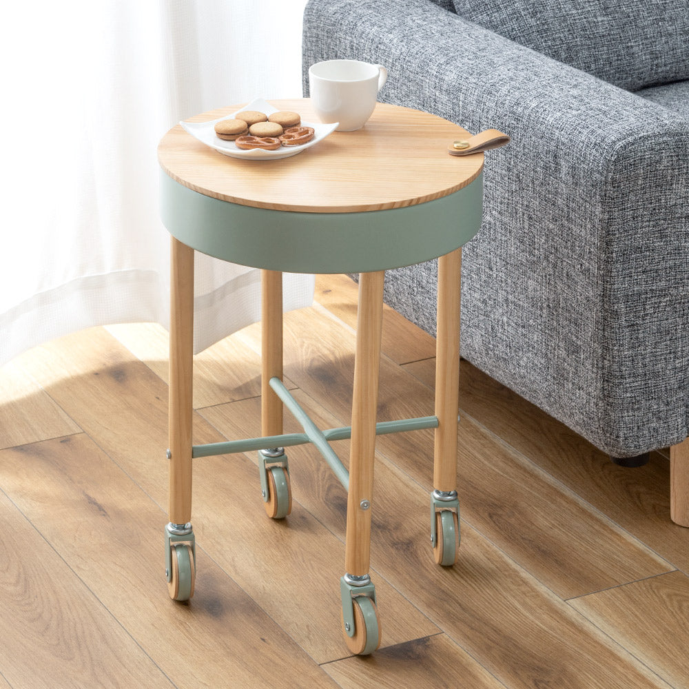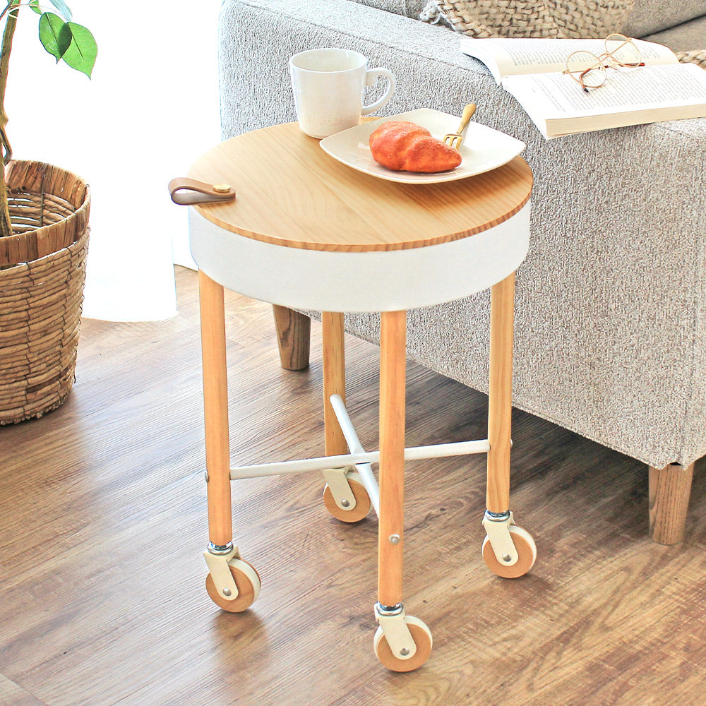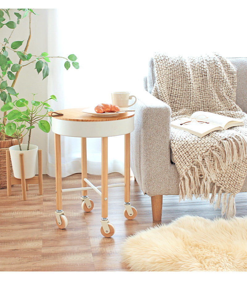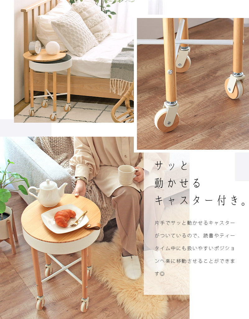 サッと動かせるキャスターつき。ナチュラルな木目がかわいいサイドテーブル
