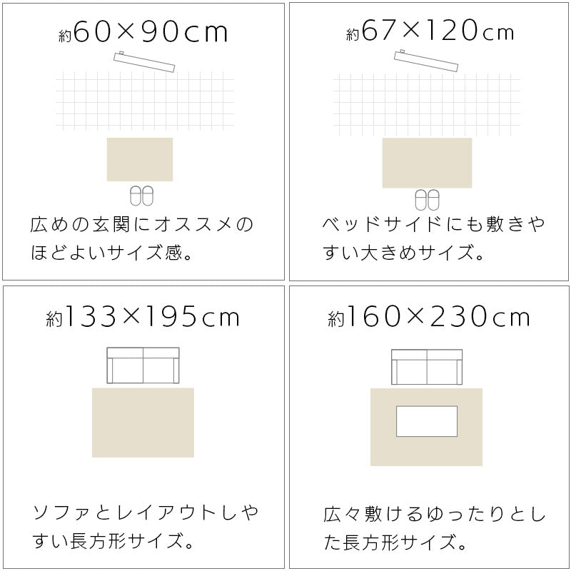 | サイズ | 約133×195cm / 約160×230cm / 約200×200cm / 約200×250cm / 約240×240cm / 約240×330cm 厚さ:13mm ※玄関マットサイズはこちら |