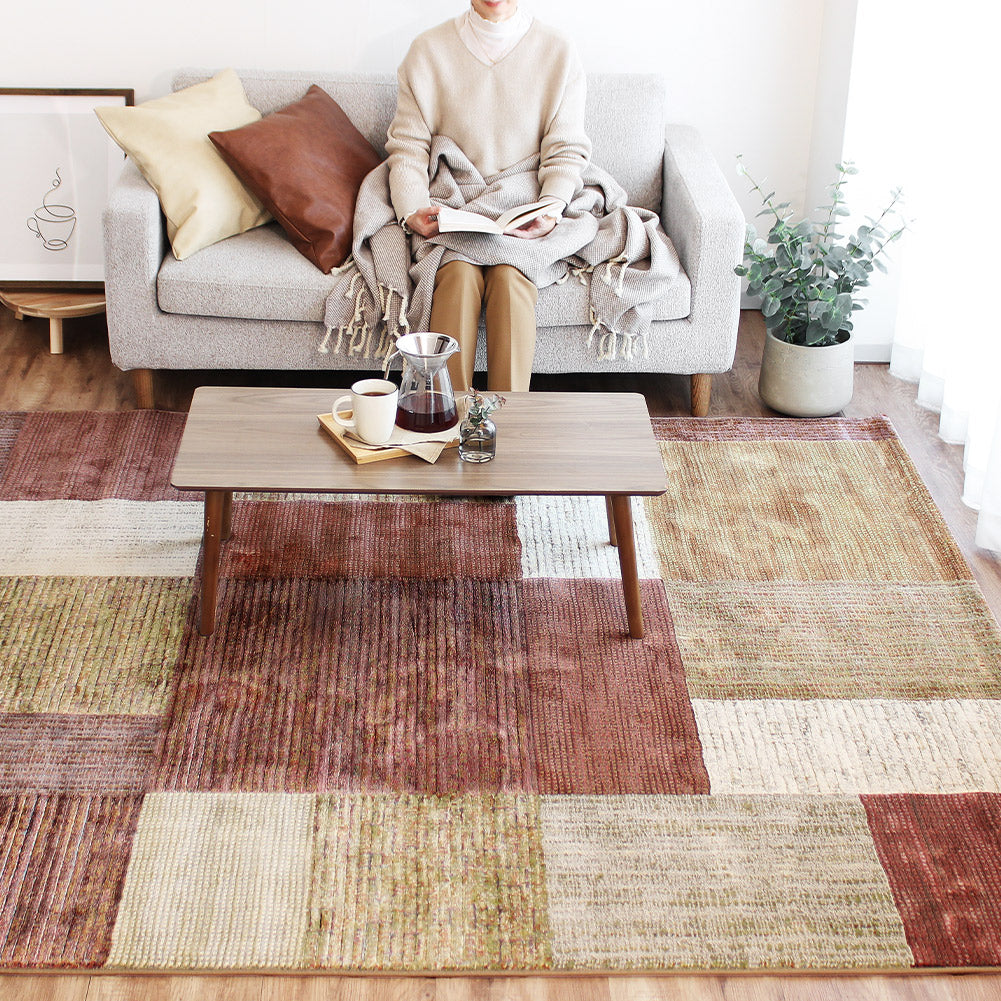 豊富な色糸で折り込まれ、糸抜き製法によって生み出される立体感が奥行きのある1枚。大胆なランダムブロック柄がモダンな空間を演出し、敷くだけでお部屋が高級感のある雰囲気になります。『ウィルトン織り』は18世紀中期のイギリス・ウィルトン市で誕生した機械織りで、表面の模様を作るものとは別に地経糸(じだていと)・覆経糸(おおいだていと)・緯糸(よこいと)の4種の糸でしっかりと織られているため、優れた耐久性と美しい織り模様が楽しめます。また、表面に熱処理を加える『ヒートセット加工』が施されています。糸同士が縮れて絡むことで抜けにくくなり、ボリュームも生まれます。