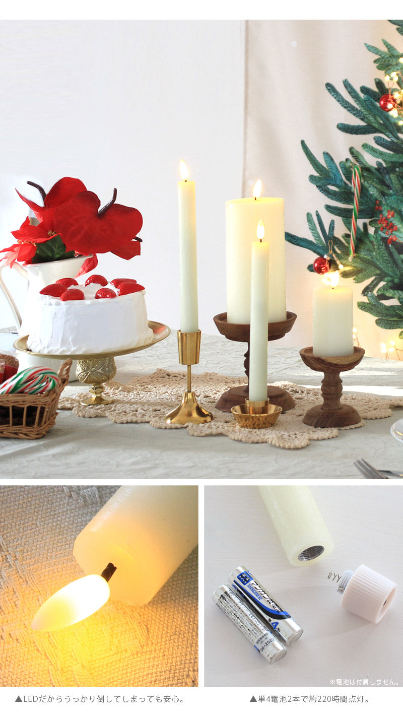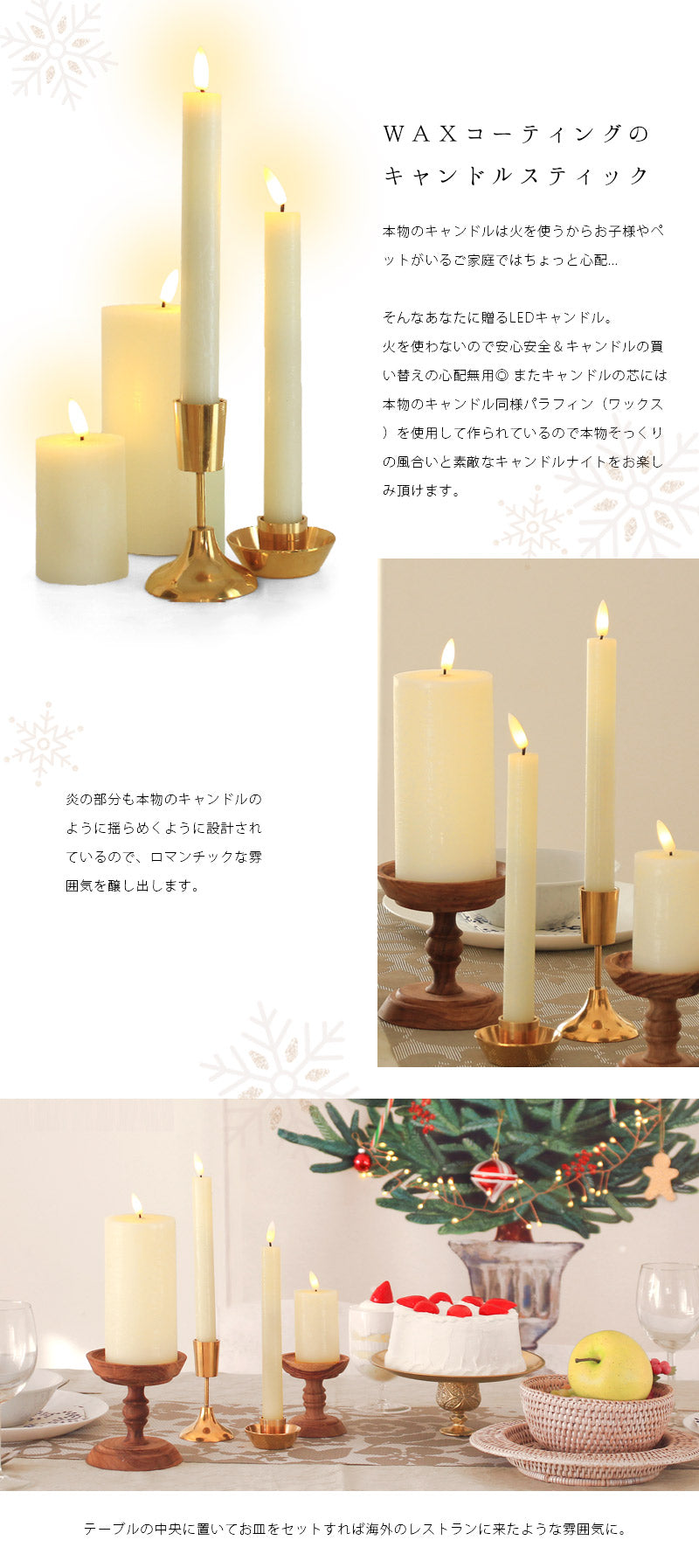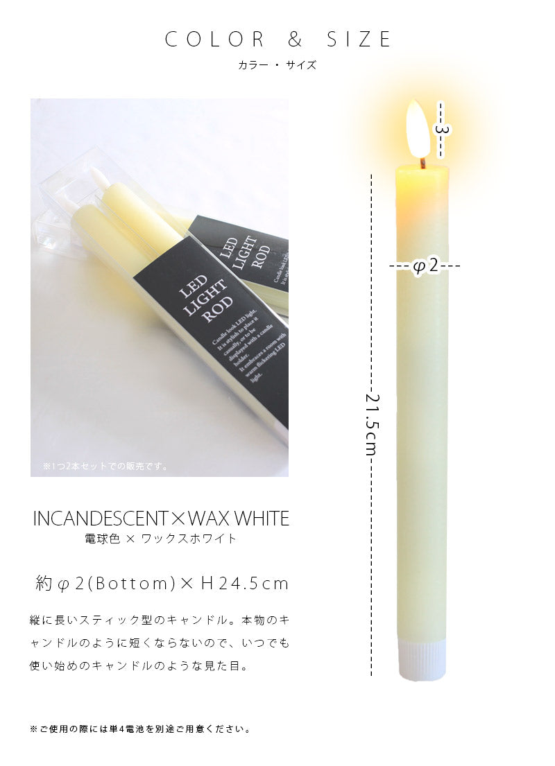 本物のキャンドルは火を使うからお子様やペットがいるご家庭ではちょっと心配...そんなあなたに贈るLEDキャンドル。火を使わないので安心安全&キャンドルの買い替えの心配無用◎ またキャンドルの芯には本物のキャンドル同様パラフィン(ワックス)を使用して作られているので本物そっくりの風合いと素敵なキャンドルナイトをお楽しみ頂けます。キャンドルの種類の中でも高さのあるロッド(杖)タイプは並べて飾ったり、他の小物と高低差を出してお洒落見えするコーディネートにピッタリ!食卓や玄関まわりのディスプレイスペースを華やかにしてくれます。