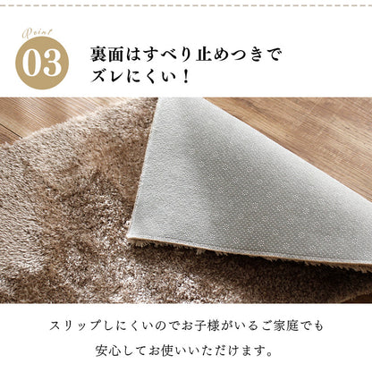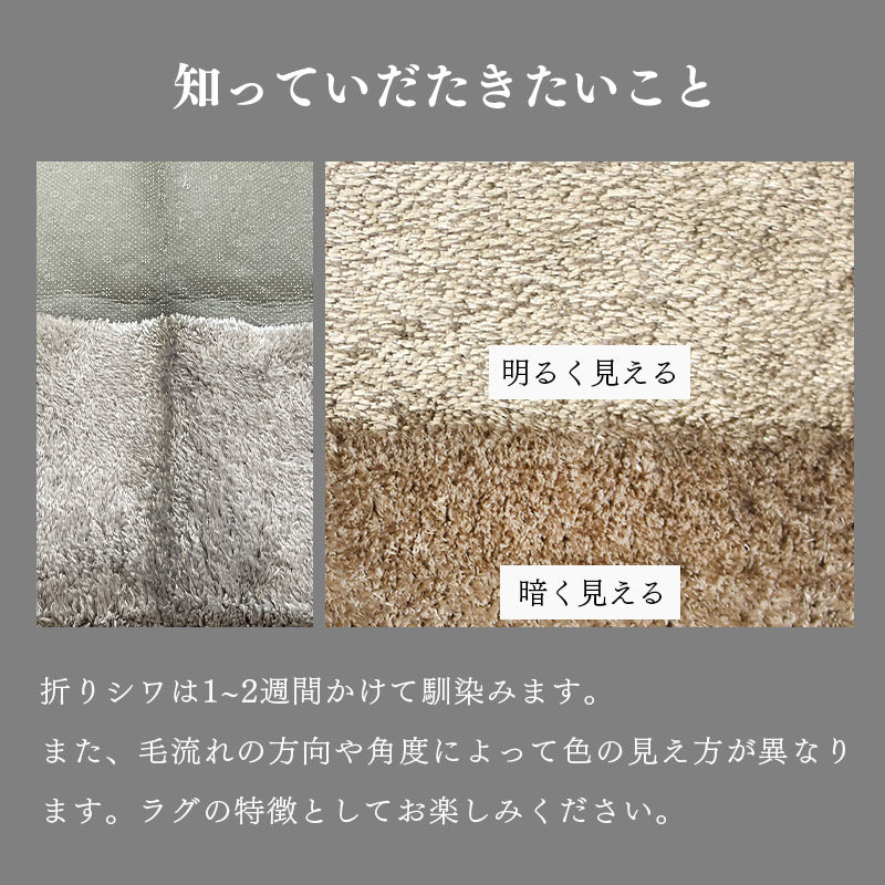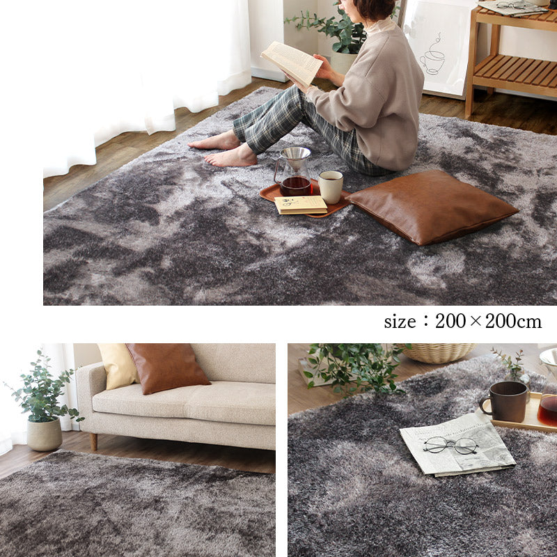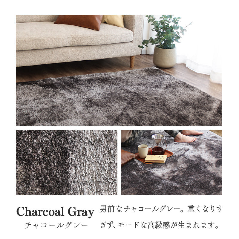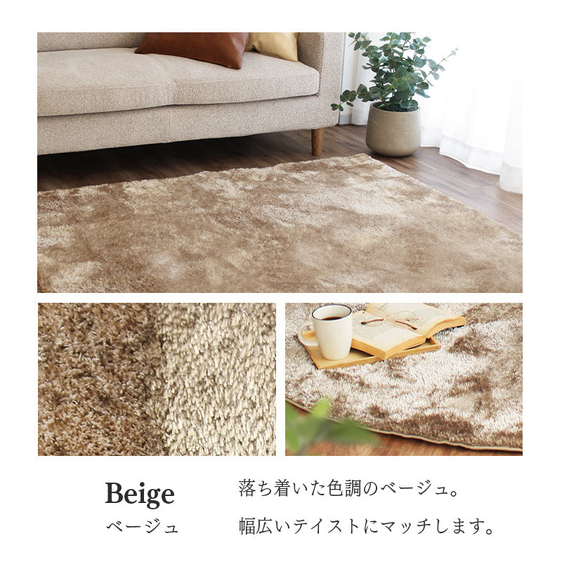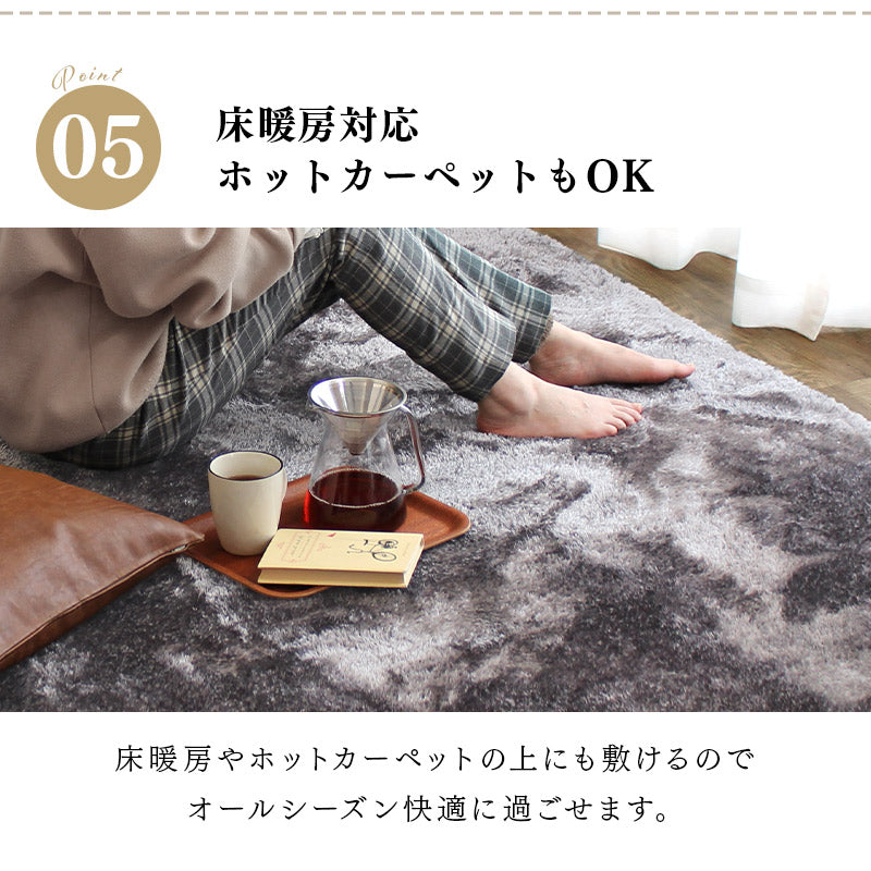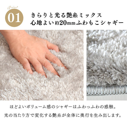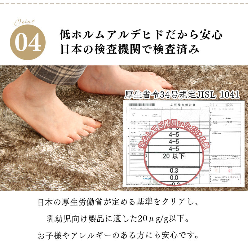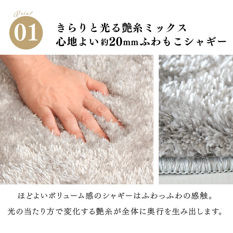 約20mmのほどよいボリューム感のシャギーはふわっふわの感触。ミックスされた艶糸は光の当たり方で表情が変わり、空間全体に奥行を生み出します。うっかり汚してしまっても洗濯機で丸洗いができるのでいつでも清潔!お手入れが簡単なので普段使いに◎床暖房&ホットカーペットにも対応しているのでオールシーズン快適!低ホルムアルデヒドなのでアレルギーなどの敏感な体質の方、赤ちゃんやペットのいるご家庭でも安心してご使用いただけます。