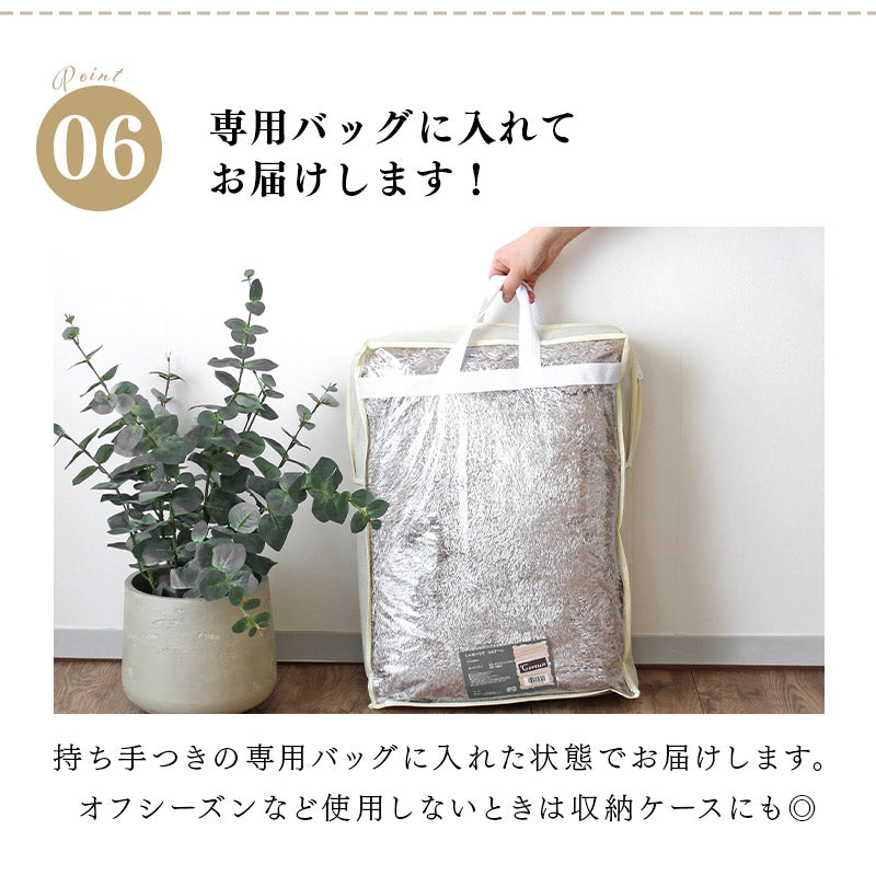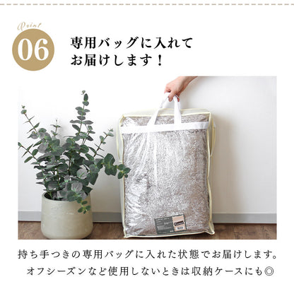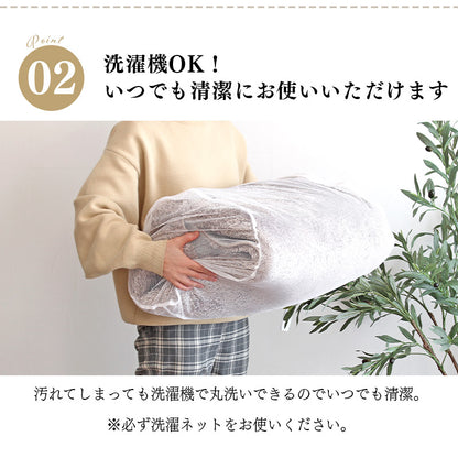 | お手入れ方法 | ●必ず洗濯ネットを使用し弱流水モードや手洗いモードで洗濯してください。 ●洗濯用中性洗剤をご使用ください。 ●ドライクリーニング不可 ●タンブラー乾燥不可 【洗濯容量目安】 ●~2畳まで:6kg ●3畳まで:8kg ※ドラム式洗濯機では洗えません。 ※洗濯機の形状により入らない場合は手洗いしてください。 |