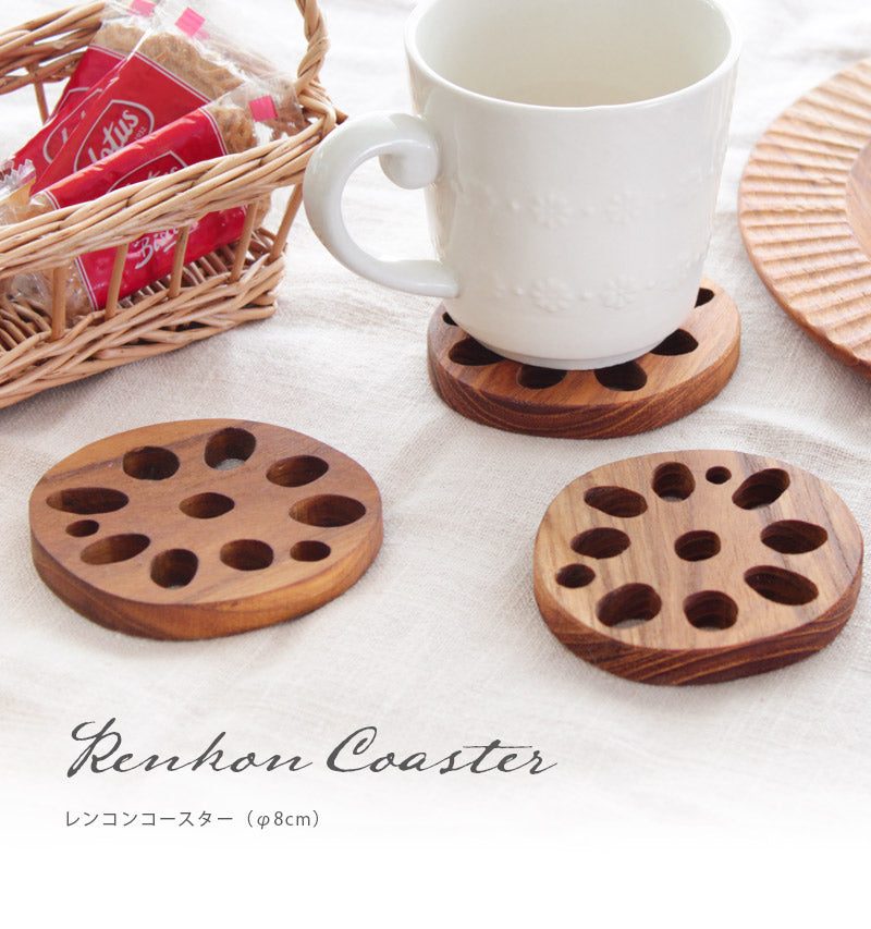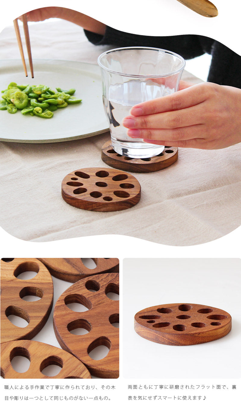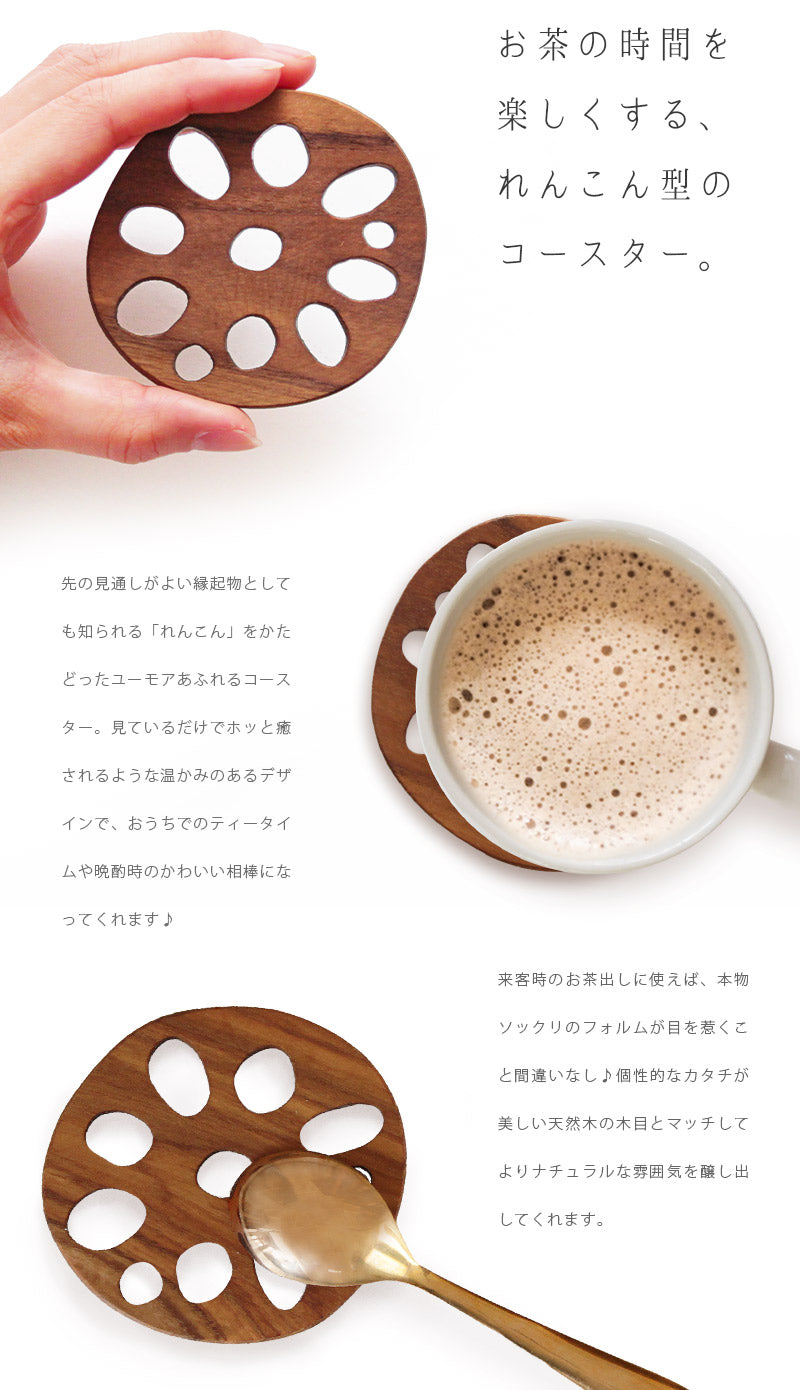 先の見通しがよい縁起物としても知られる「れんこん」をかたどったユーモアあふれるコースター。見ているだけでホッと癒されるような温かみのあるデザインで、おうちでのティータイムや晩酌時のかわいい相棒になってくれます。来客時のお茶出しに使えば、本物ソックリのフォルムが目を惹くこと間違いなし♪個性的なカタチが美しい天然木の木目とマッチしてよりナチュラルな雰囲気を醸し出してくれます。