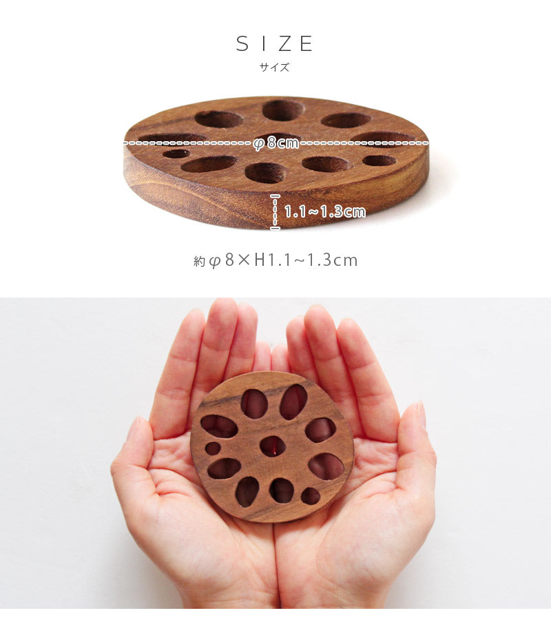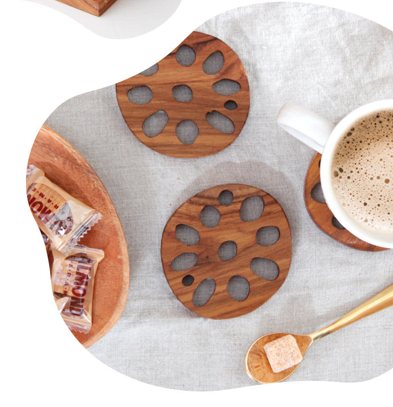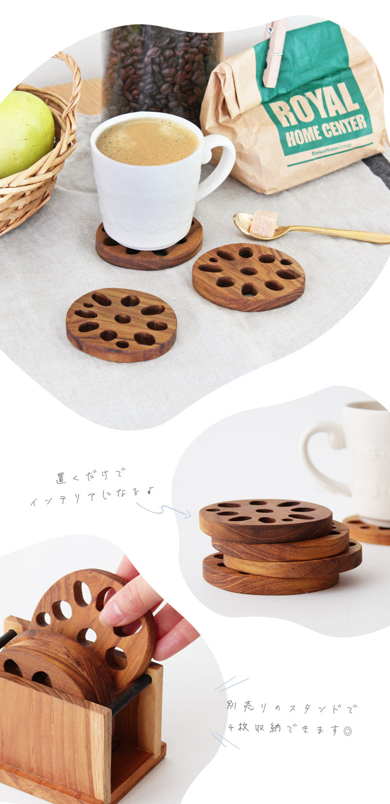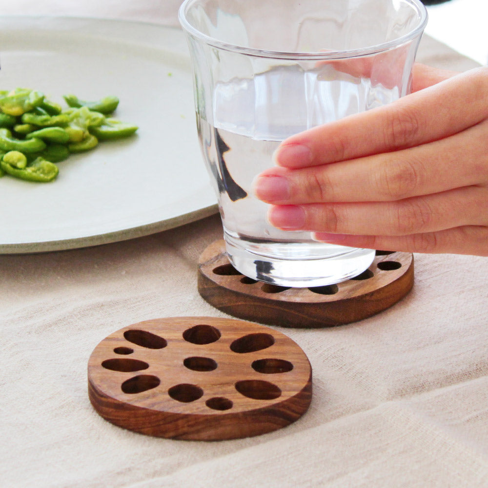 先の見通しがよい縁起物としても知られる「れんこん」をかたどったユーモアあふれるコースター。見ているだけでホッと癒されるような温かみのあるデザインで、おうちでのティータイムや晩酌時のかわいい相棒になってくれます。来客時のお茶出しに使えば、本物ソックリのフォルムが目を惹くこと間違いなし♪個性的なカタチが美しい天然木の木目とマッチしてよりナチュラルな雰囲気を醸し出してくれます。