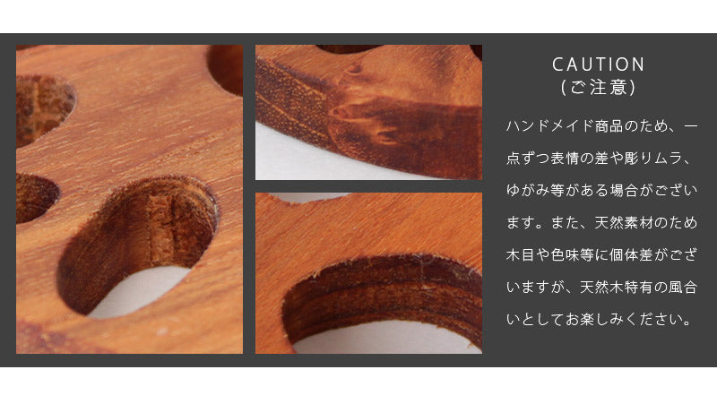 | 備考 | ●木の乾燥を防ぐため表面にオイルコーティングを施しており、布や紙などの沁み込みやすいものと長時間触れているとオイルがにじむことがございますのでご注意ください。 ●直射日光にあたる場所や熱、火は避けてください。 ●こちらの商品は天然木のため、ふしや歪みが出たり模様や色合いサイズなどひとつずつ個体差が生じます。予めご了承ください。 |
