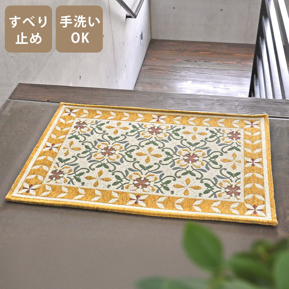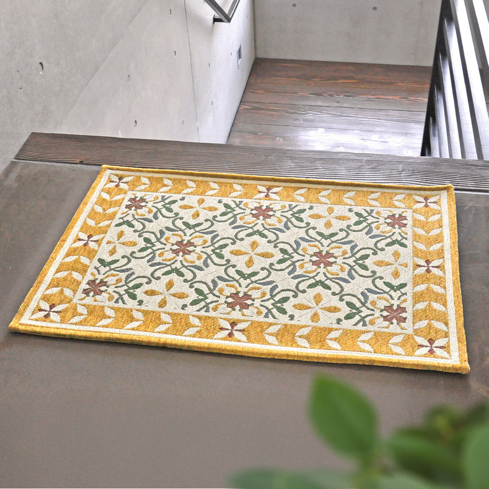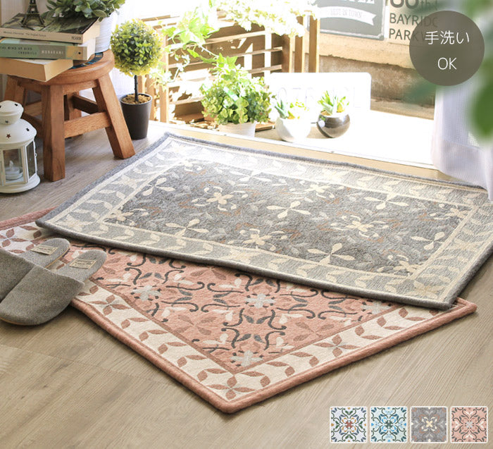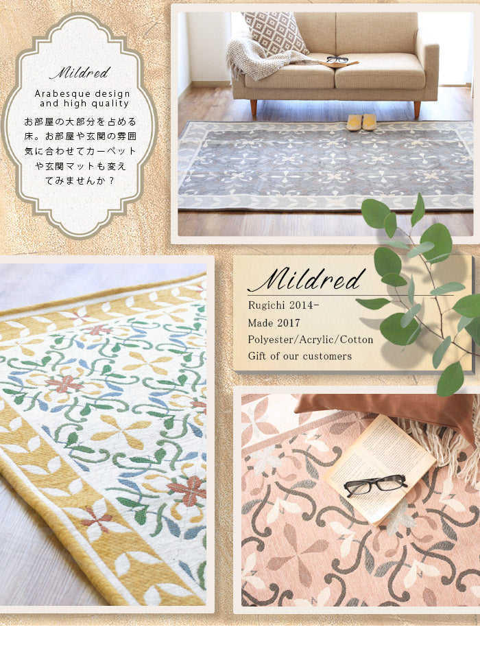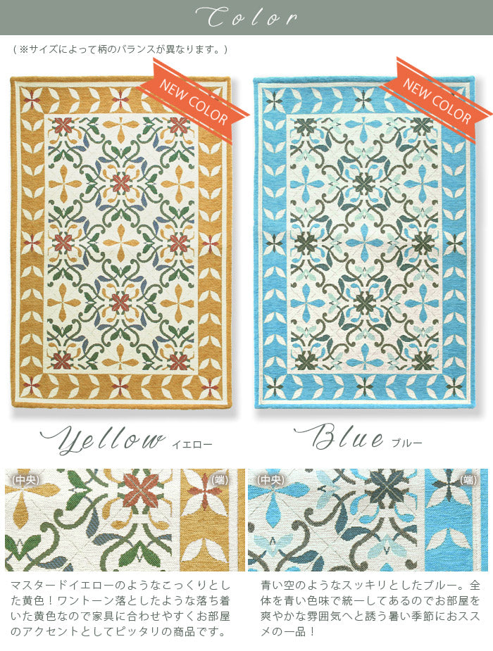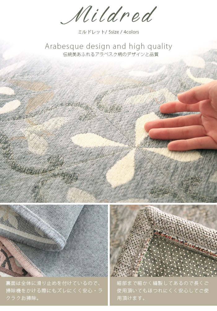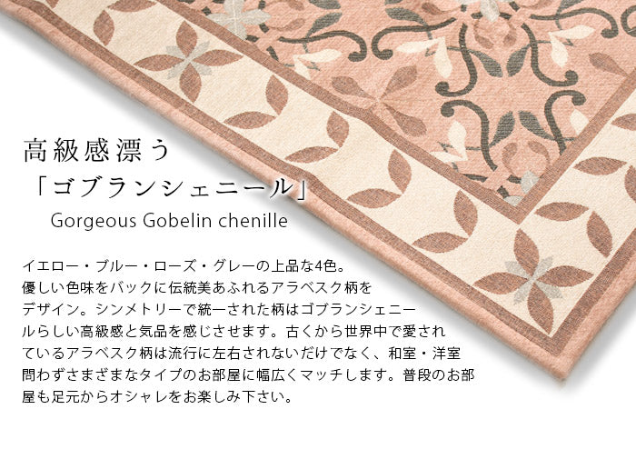 エレガントな色味で仕上げた一枚。優しい色味をバックに伝統美あふれるアラベスク柄をデザイン。シンメトリーで統一された柄はゴブランシェニールらしい高級感と気品を感じさせます。古くから世界中で愛されているアラベスク柄は流行に左右されないだけでなく、和室・洋室問わずさまざまなタイプのお部屋に幅広くマッチします。普段のお部屋も足元からオシャレをお楽しみ下さい。