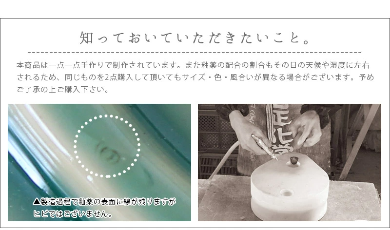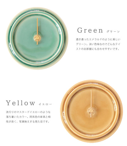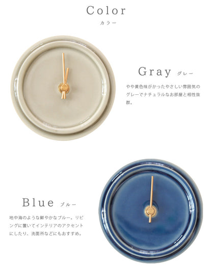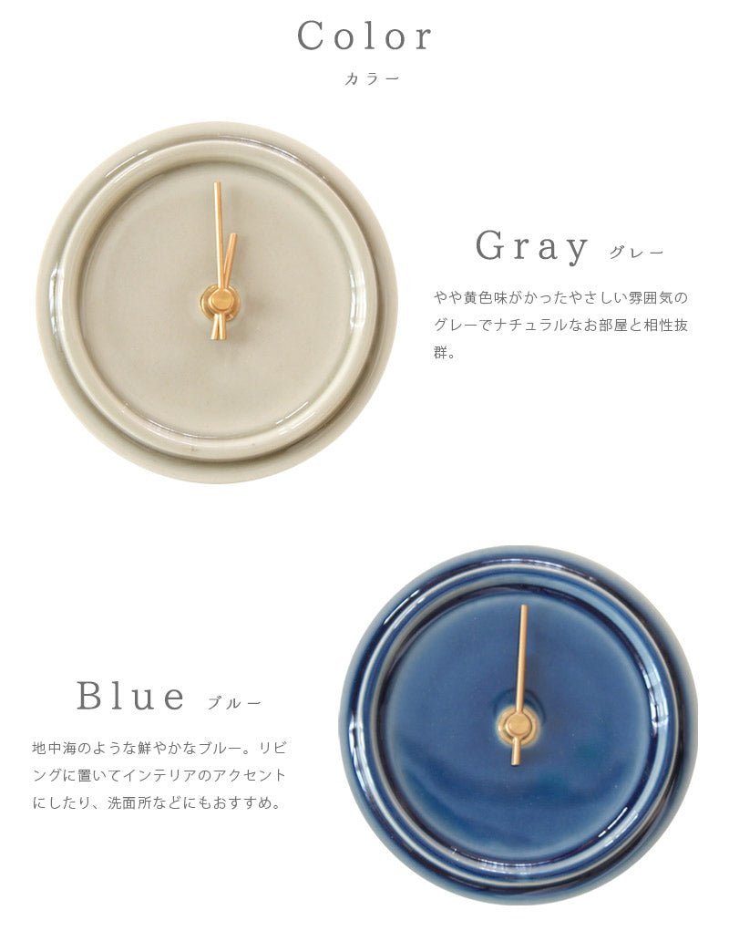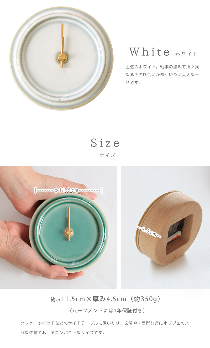 | 備考 | ●アラーム機能・秒針なし。 ●ムーブメントには1年保証がついています。ご購入後1年間は付属の保証書を大切に保管して下さい。 ●単三電池1本使用(動作確認用の電池一本付属) ●本商品は一点一点手作りで制作されています。また釉薬の配合の割合もその日の天候や湿度に左右されるため、同じものを2点購入して頂いてもサイズ・色・風合いが異なる場合がございます。予めご了承の上ご購入下さい。 |