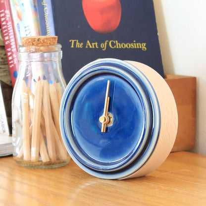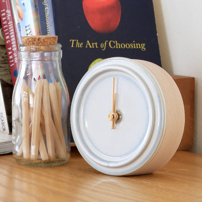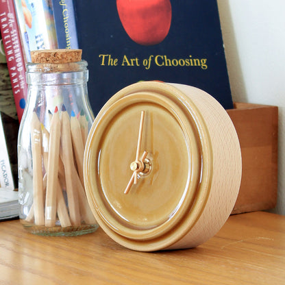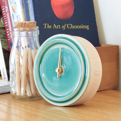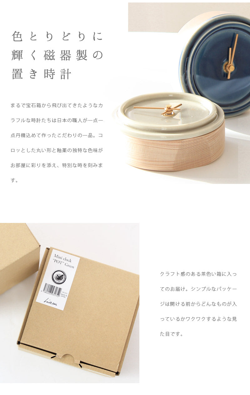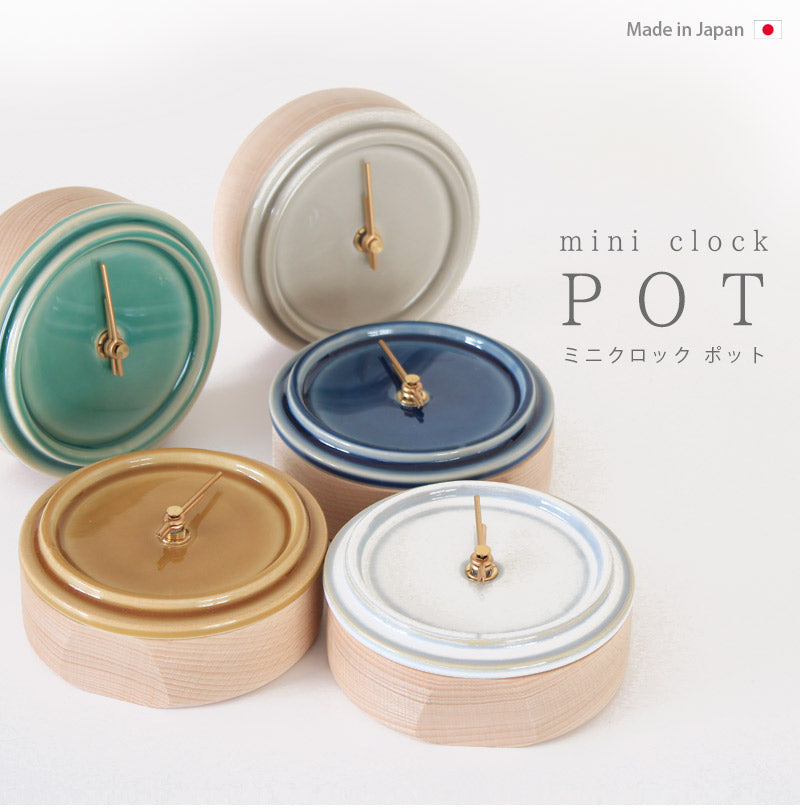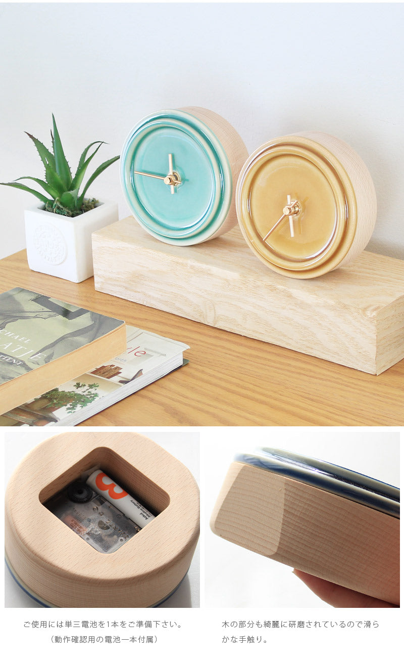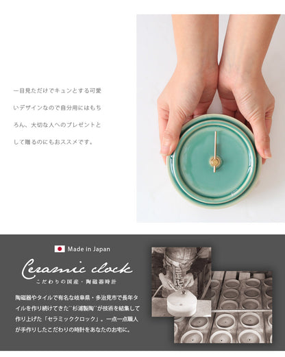 陶磁器やタイルで有名な岐阜県・多治見市で長年タイルを作り続けてきた「杉浦製陶」が技術を結集して作り上げた置き時計です。まるで宝石箱から飛び出てきたようなカラフルなデザインはコロッとした丸い形と釉薬の独特な色味がお部屋に彩りを添えます。木と焼き物という温かみのある自然の素材感と、高級感のあるゴールドの針が特徴で自分用にはもちろん誰がにプレゼントしたくなるような大人可愛い一品です。