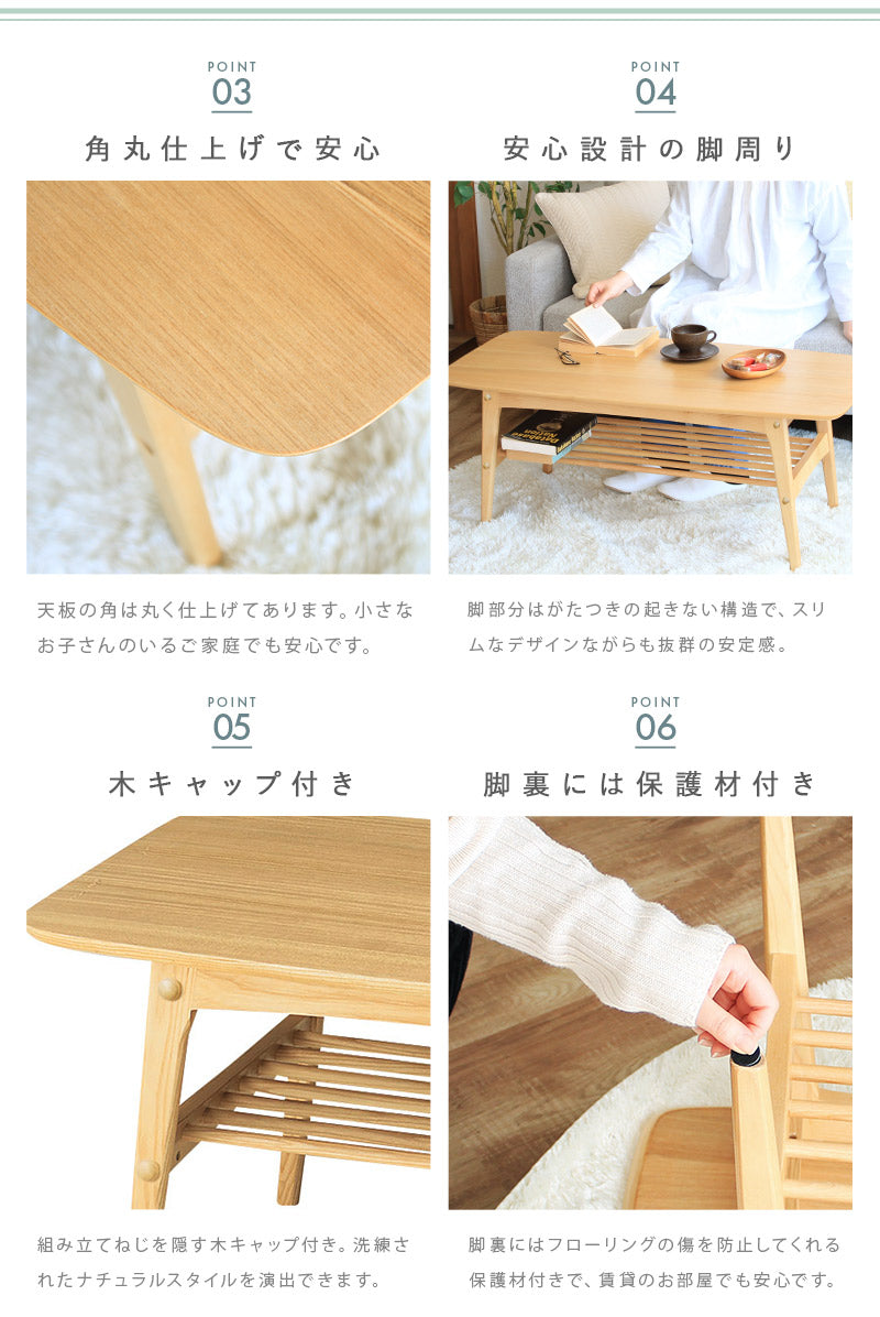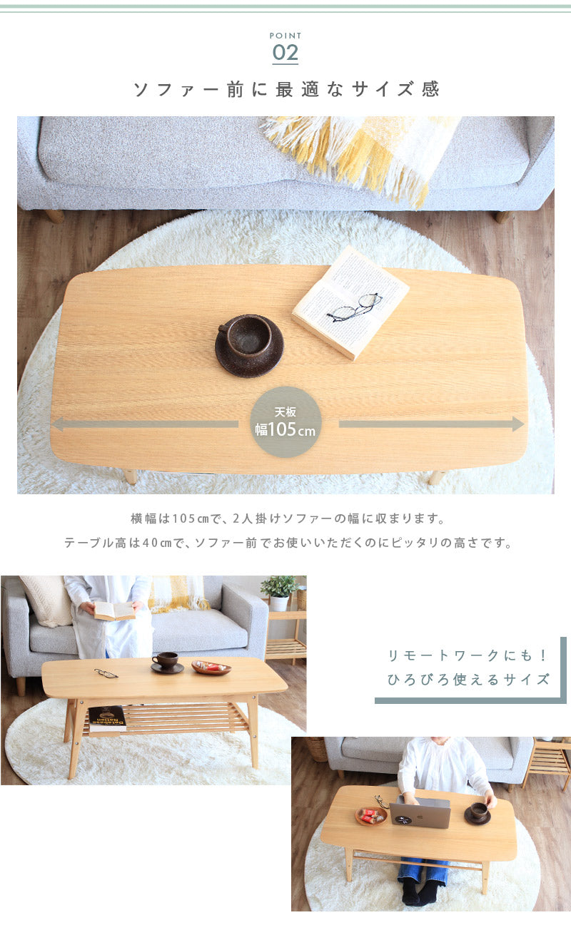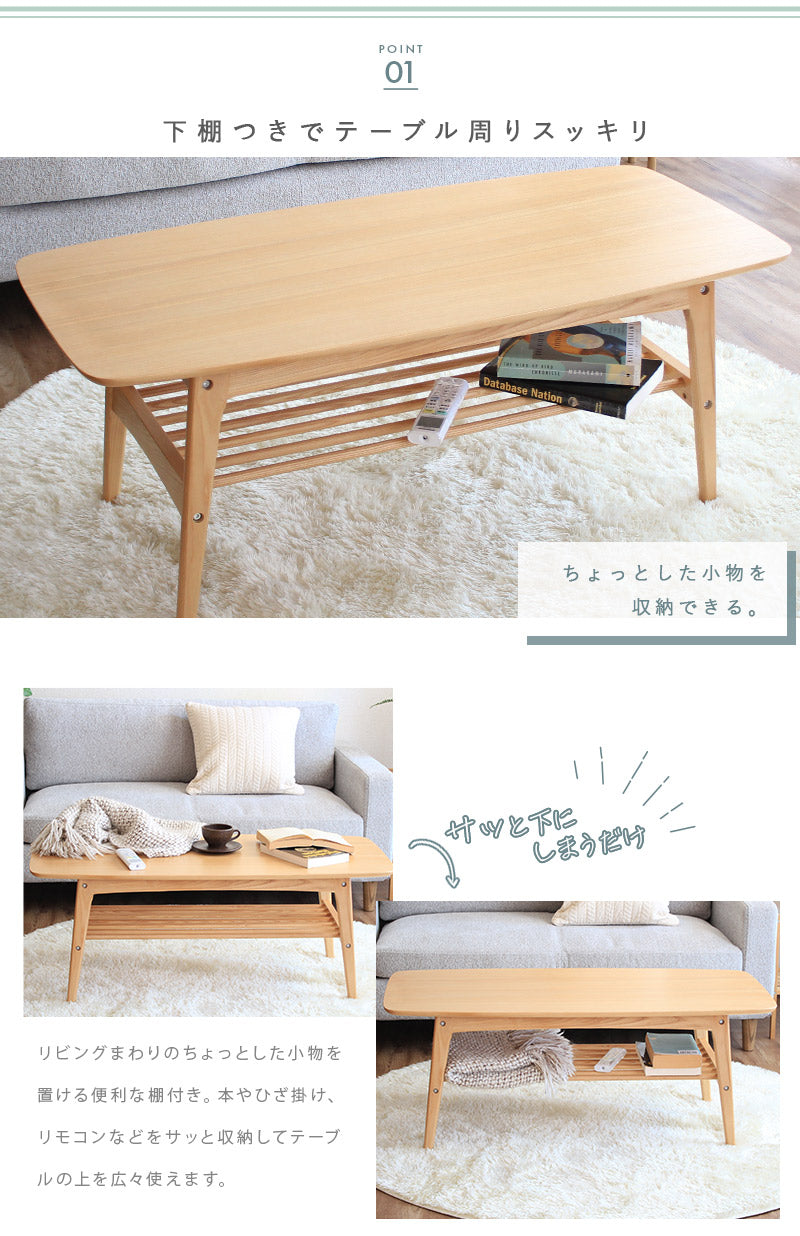 リビングまわりのちょっとした小物を置ける便利な棚付き。本やひざ掛け、リモコンなどをサッと収納してテーブルの上を広々使えます。