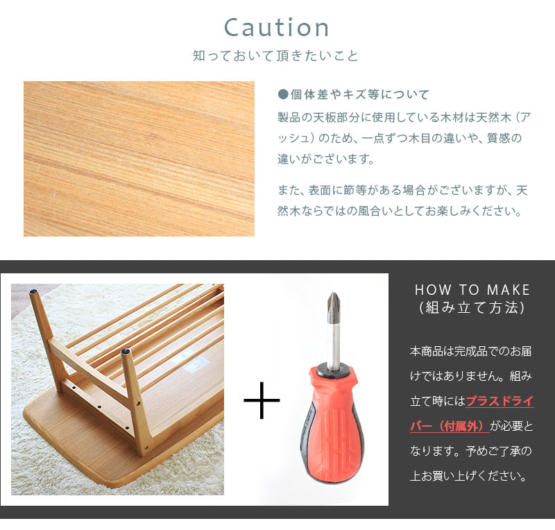 | 注意事項 | ●同梱してある説明書の組み立て手順に従って組み立ててください。 ●先に緩めに全体を組上げ、最後に全てのネジを本締めしてください。 ●平坦な場所に安定させた状態で使用してください。 ●著しい汚れを落とす場合は、薄めた中性洗剤を使用してください。 ●過度に重いものを上に置かないでください。 |