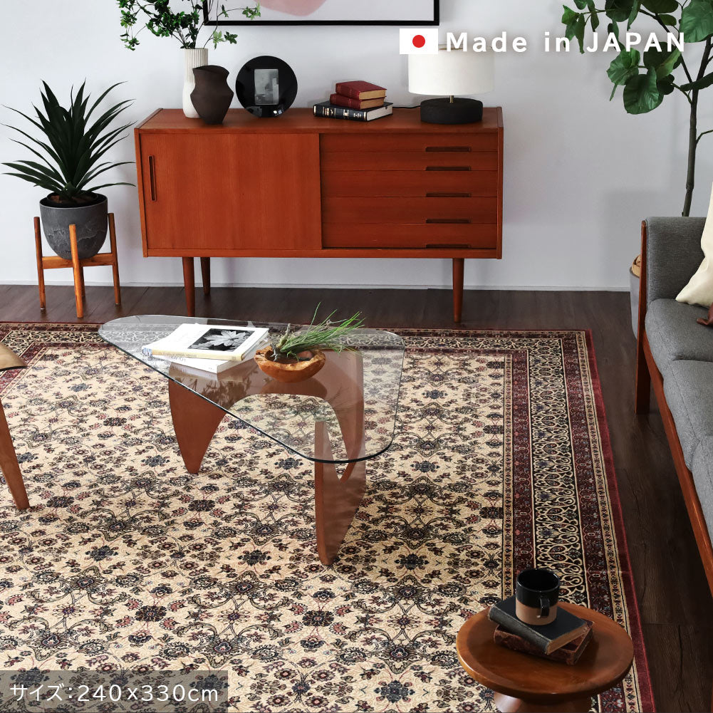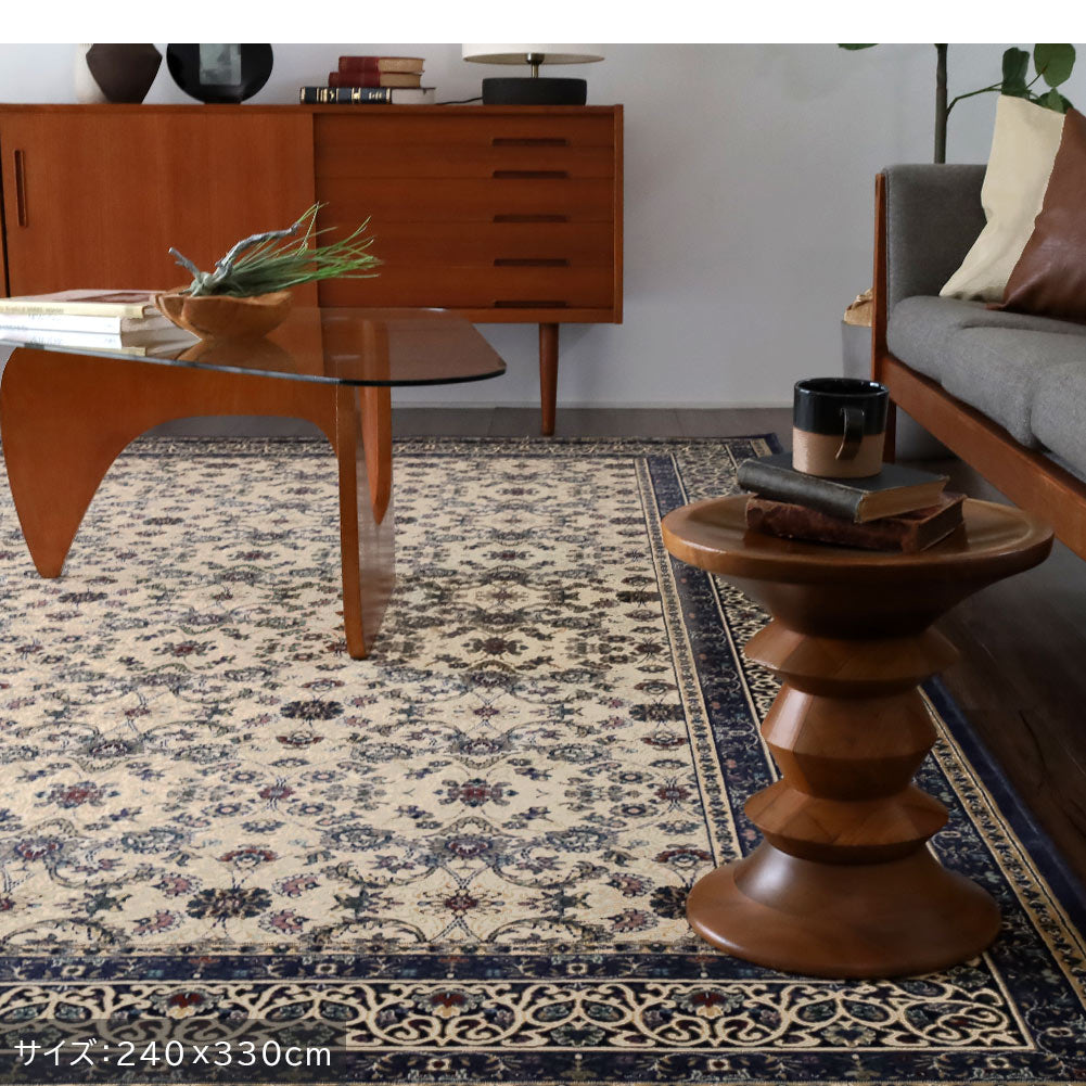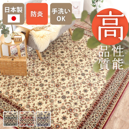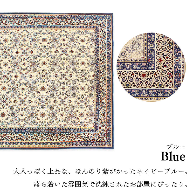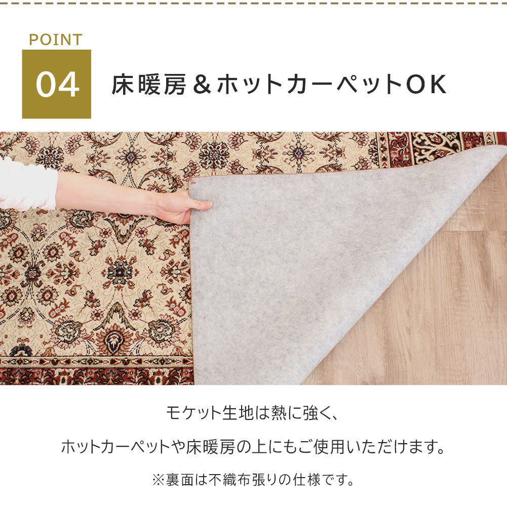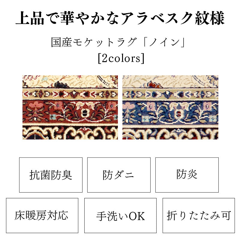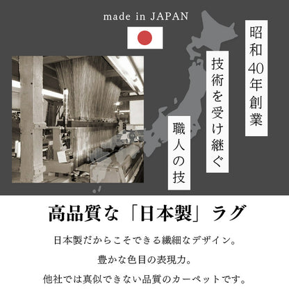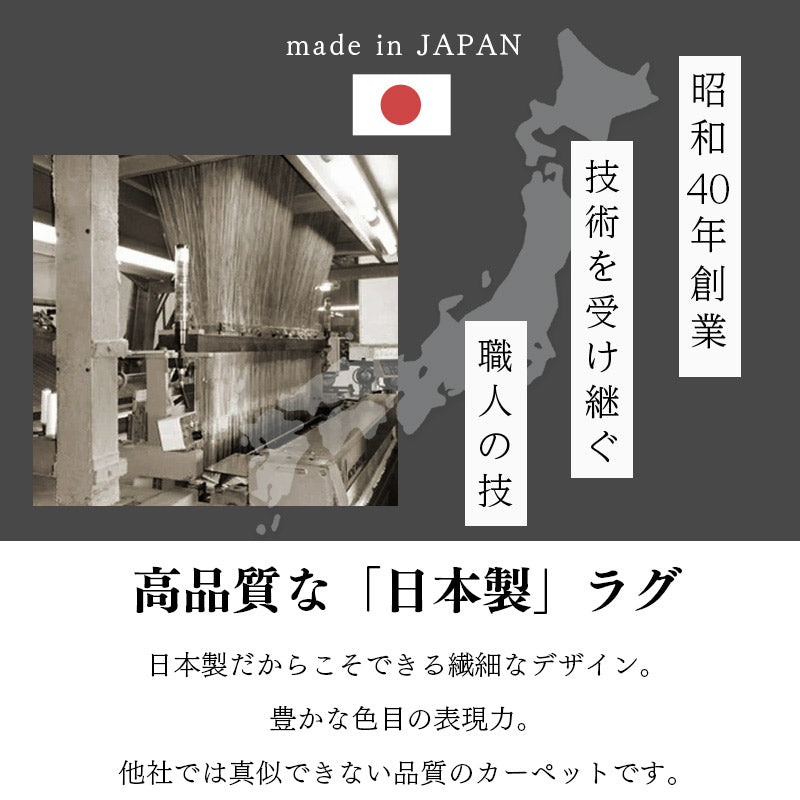 日本国内の老舗メーカーで丁寧につくられた、こだわりのある繊細な織りのアラベスク柄。ヴィンテージラグのような重厚感。お部屋の雰囲気をグッと引き上げてくれます。モケット織りのラグは耐久性バツグン。また、高密度かつ毛足の短いパイルの滑らかな断面で触り心地がよく、軽量で柔らかいので扱いやすいのが特徴です。密度があって毛足が短いとゴミが入り込みにくく汚れに強いのでお手入れ簡単◎サラサラなパイルはへたりにくく夏場の蒸し暑い時期も肌に張り付かず、冬は冷たい床をしっかりカバーしてくれるため、オールシーズン快適にお使いいただけます。機能性に優れたラグで、防炎加工や抗菌、防臭、防ダニ加工が施されています。抗菌防臭加工により、繊維上の菌の増殖を抑制。防ダニ機能付きで、ペットや小さなお子様がいるご家庭でも安心してお使いいただける設計です