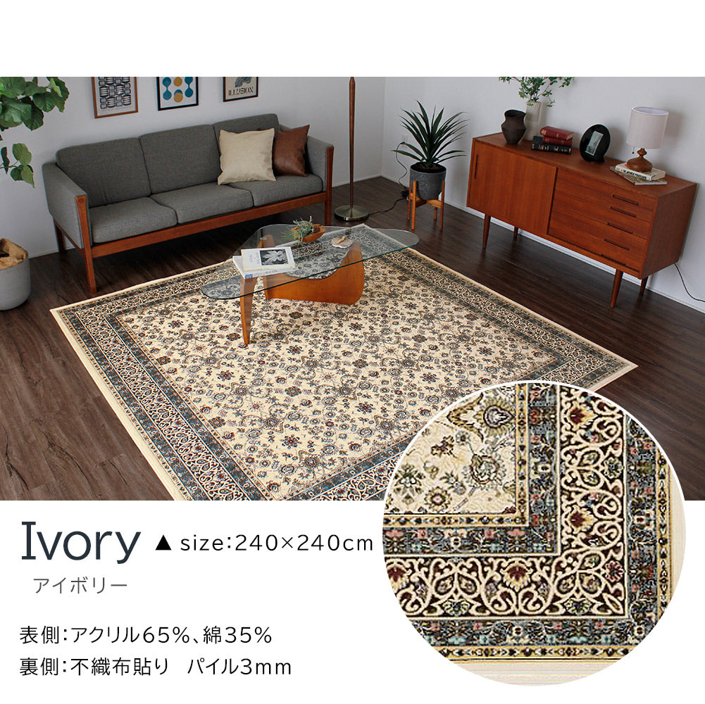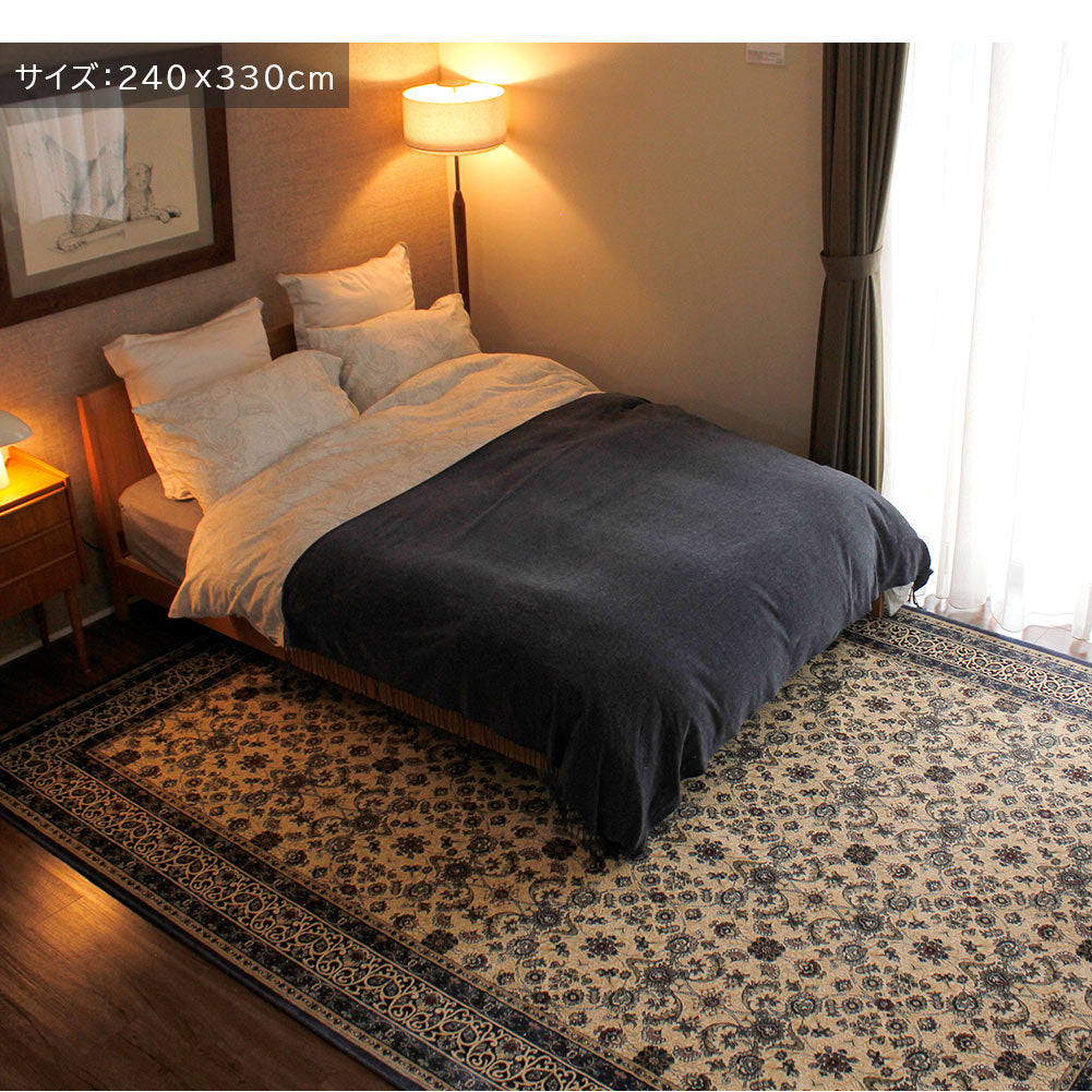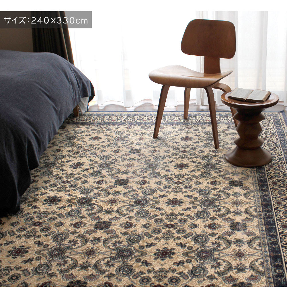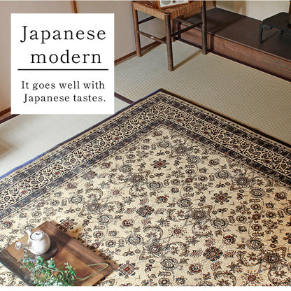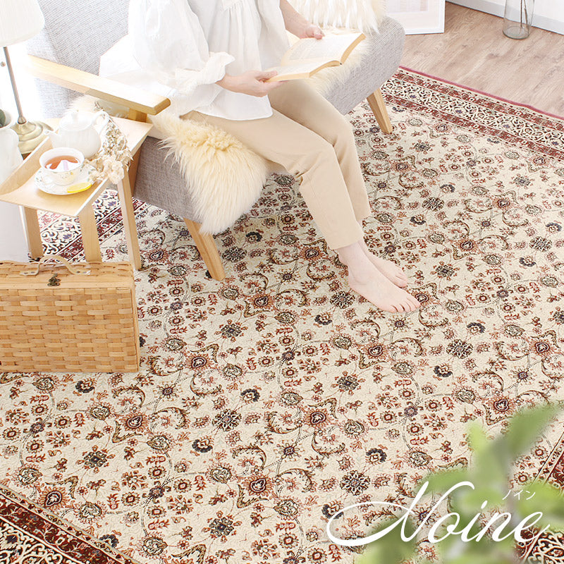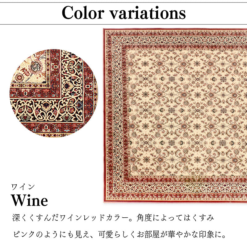 日本国内の老舗メーカーで丁寧につくられた、こだわりのある繊細な織りのアラベスク柄。ヴィンテージラグのような重厚感。お部屋の雰囲気をグッと引き上げてくれます。モケット織りのラグは耐久性バツグン。また、高密度かつ毛足の短いパイルの滑らかな断面で触り心地がよく、軽量で柔らかいので扱いやすいのが特徴です。密度があって毛足が短いとゴミが入り込みにくく汚れに強いのでお手入れ簡単◎サラサラなパイルはへたりにくく夏場の蒸し暑い時期も肌に張り付かず、冬は冷たい床をしっかりカバーしてくれるため、オールシーズン快適にお使いいただけます。機能性に優れたラグで、防炎加工や抗菌、防臭、防ダニ加工が施されています。抗菌防臭加工により、繊維上の菌の増殖を抑制。防ダニ機能付きで、ペットや小さなお子様がいるご家庭でも安心してお使いいただける設計です