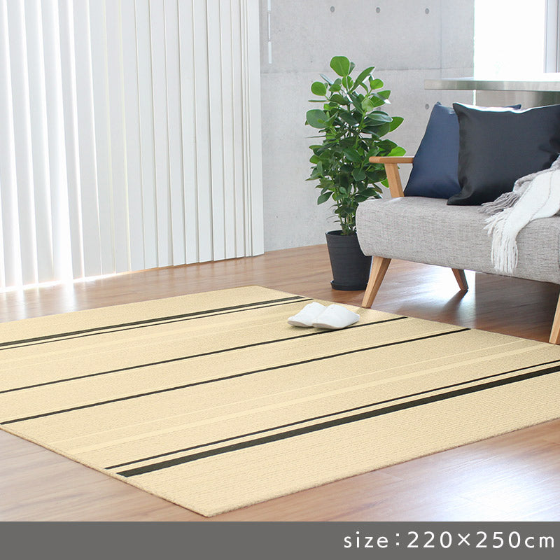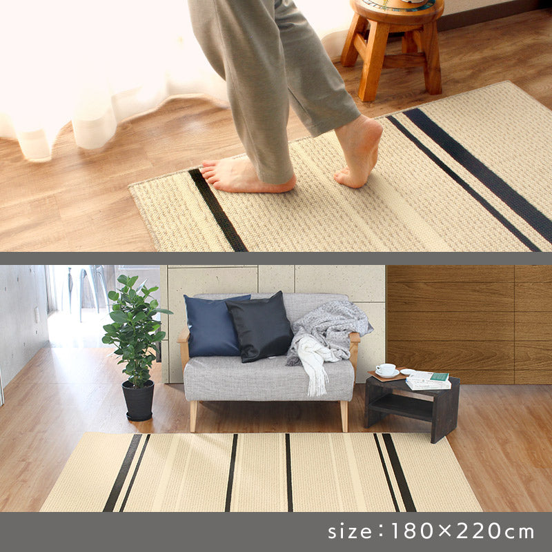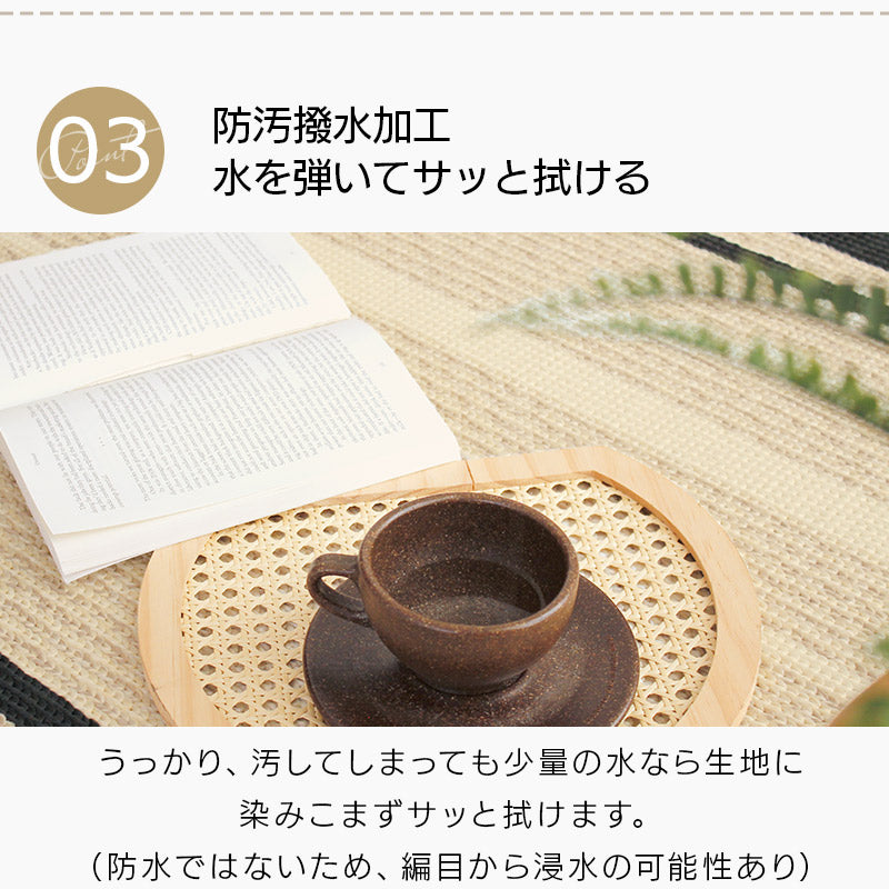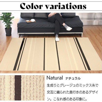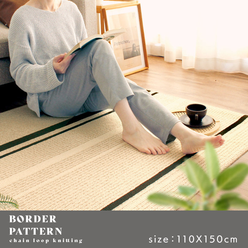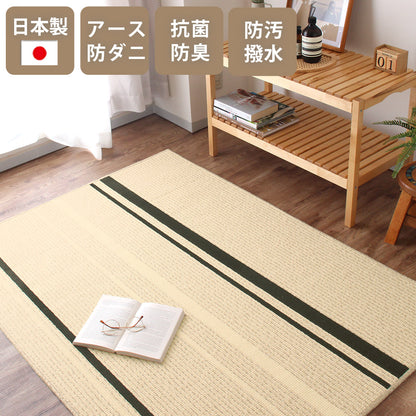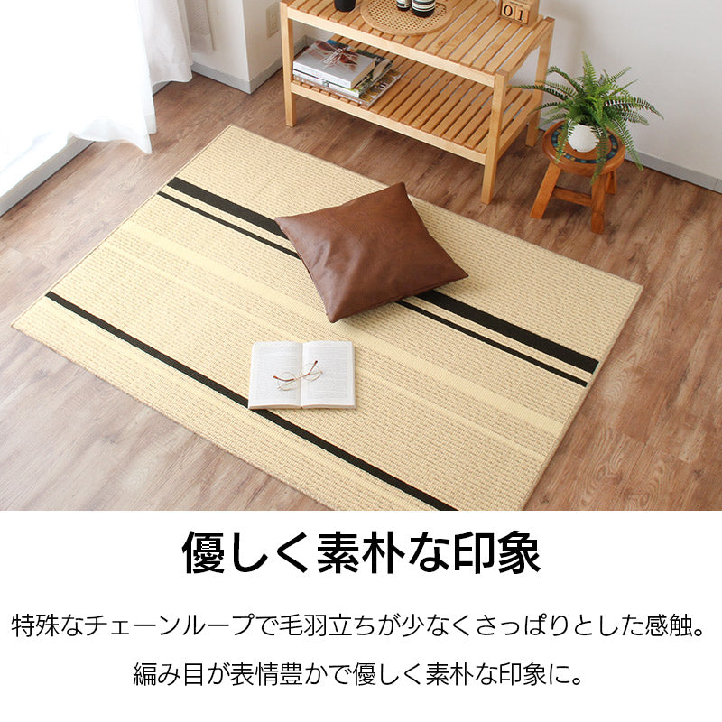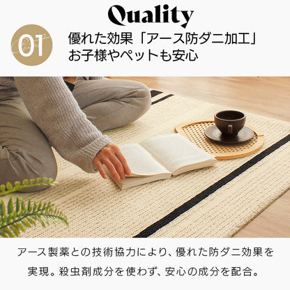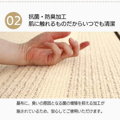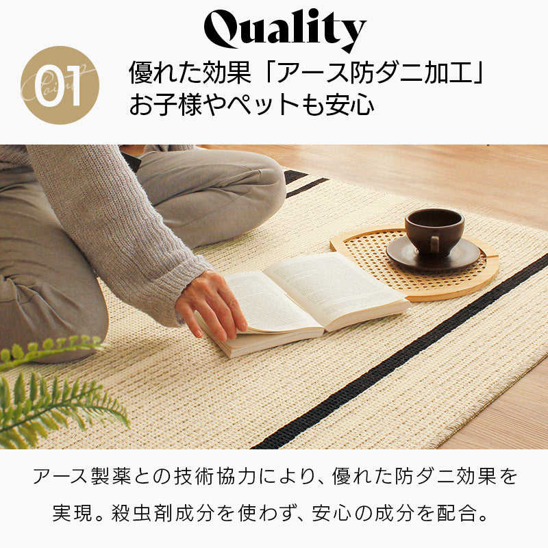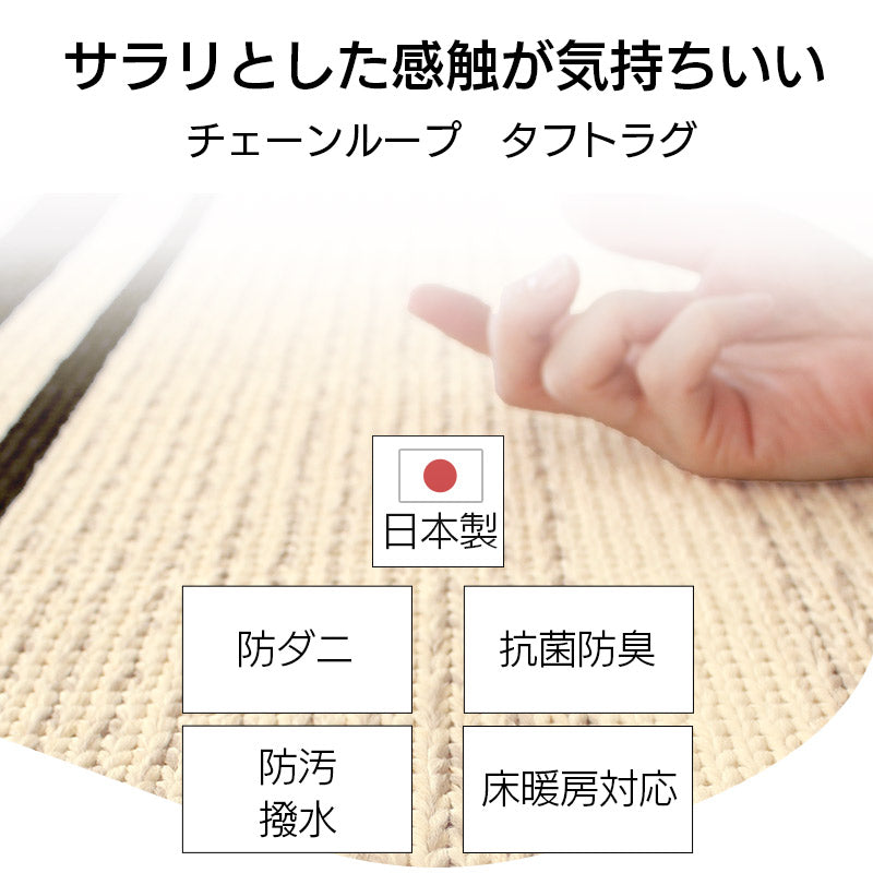 国内工場で丁寧に作られたサラリとした感触が心地よいタフトラグ。特殊なチェーンループで毛羽立ちが少なくさっぱりとした感触と編み目が表情豊かで素朴な印象に。またアース製薬との技術協力により、優れた防ダニ効果を実現。殺虫剤成分を使わないのでお子様やペットがいても安心。また、防汚撥水加工、抗菌・防臭加工、床暖房対応などデザインもさることながらご家庭で使いやすい機能が満載で高品質!暮らしにフィットするアイテムです。