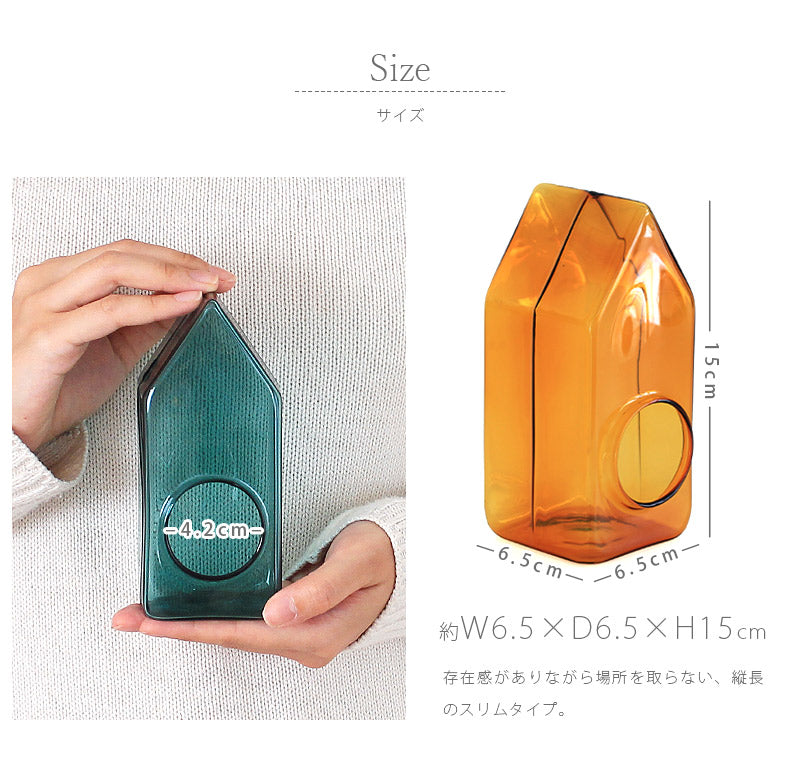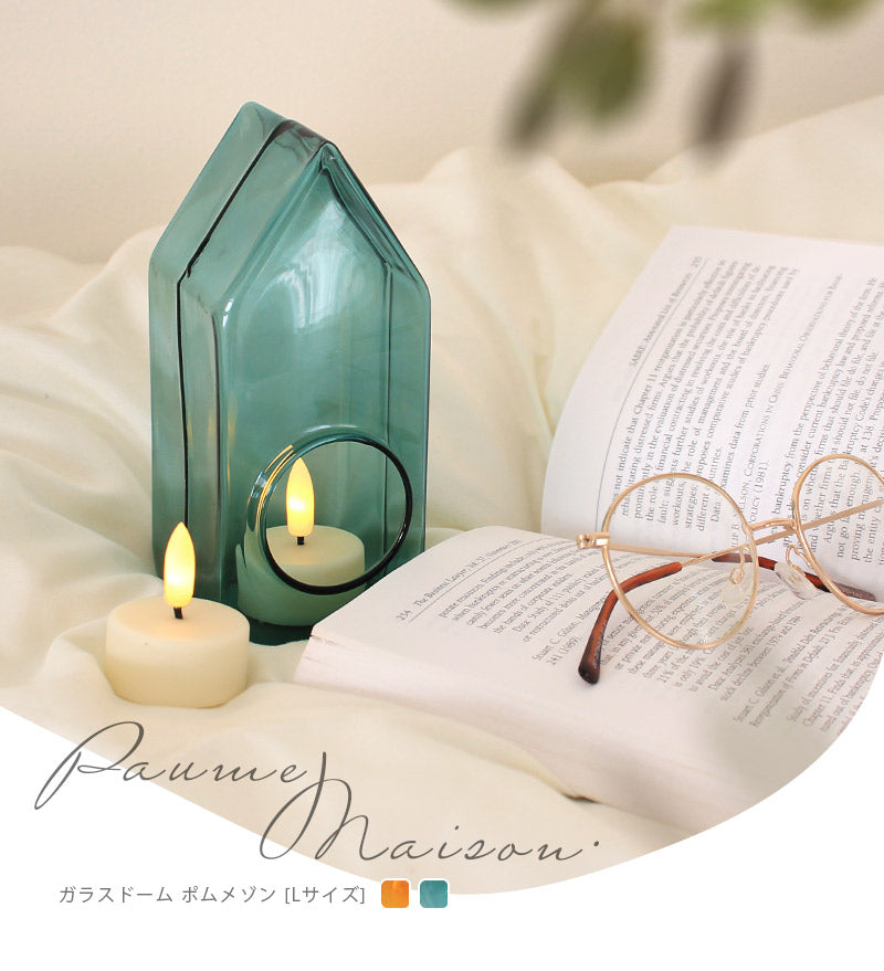 大人の遊びゴコロをくすぐる、ユニークなハウス型のガラスドーム。奥行きのあるカラーガラスの色合いはガラス本来の質感や光沢をより引き立て、空間に彩りをプラスしてくれます。別売りのLEDキャンドルライトを入れれば、イルミネーション飾りに早変わり!ほのかな優しい灯りがカラーガラスとマッチして、記念日やイベントなどの雰囲気づくりにもオススメです。カラーは2色で、どちらもカラーガラスならではのレトロでキュートな雰囲気♪飴色のような深みのある「アンバー」と北欧ムード漂う中間色の「ブルーグリーン」からお選びいただけます。照明や陽の光によっても様々な表情を見せてくれるので、きらきらと反射する光を楽しんだり、ぼんやりと色がにじむ影に癒されたり、自分だけのディスプレイを楽しめます。