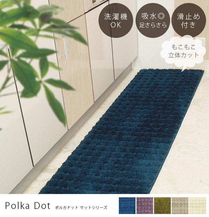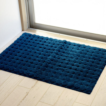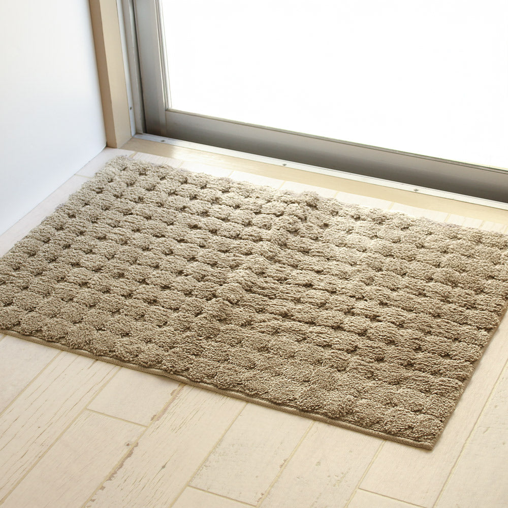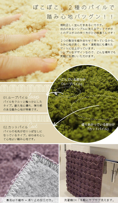 規則正しく並んだまあるいカタチ。一見、凹凸のあるシンプルなマットに見えますが、この凸凹の作り方に工夫があります。へこみの部分にはループパイルを、盛り上がってる部分にはカットパイルを使用し、弾力のあるふかふかな踏み心地に仕上げました。吸水・速乾性にも優れています。