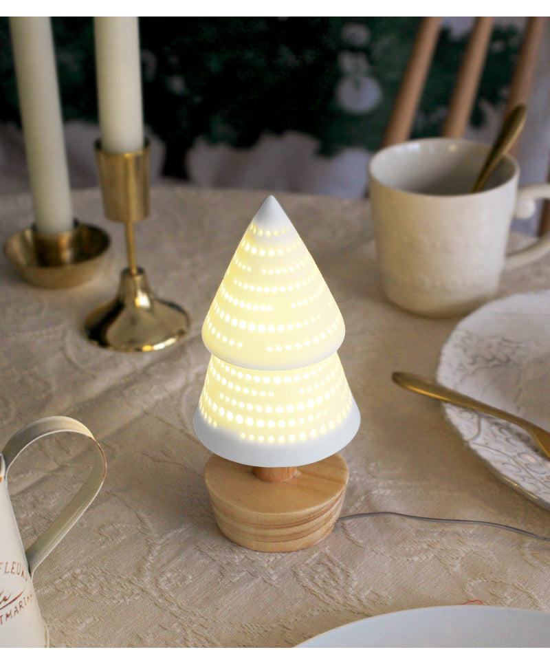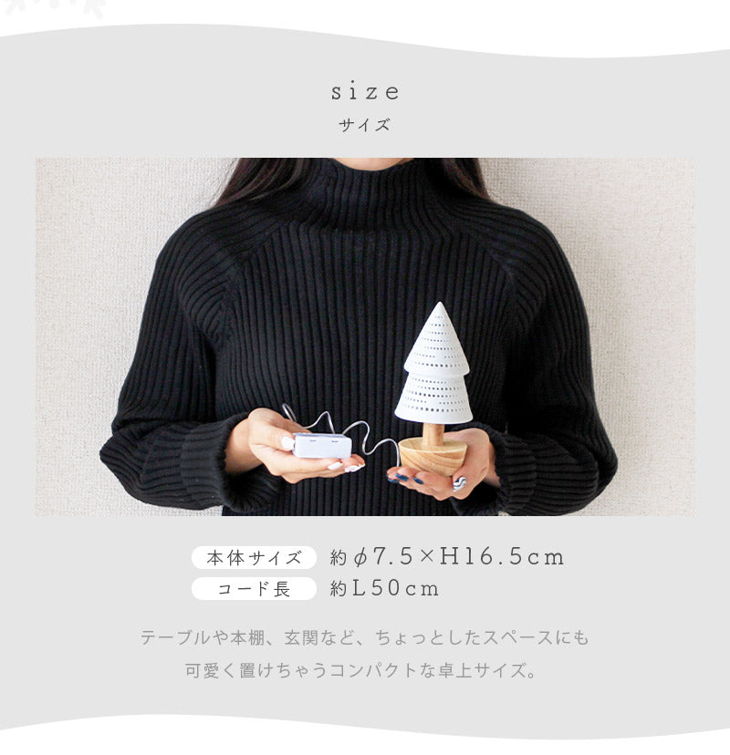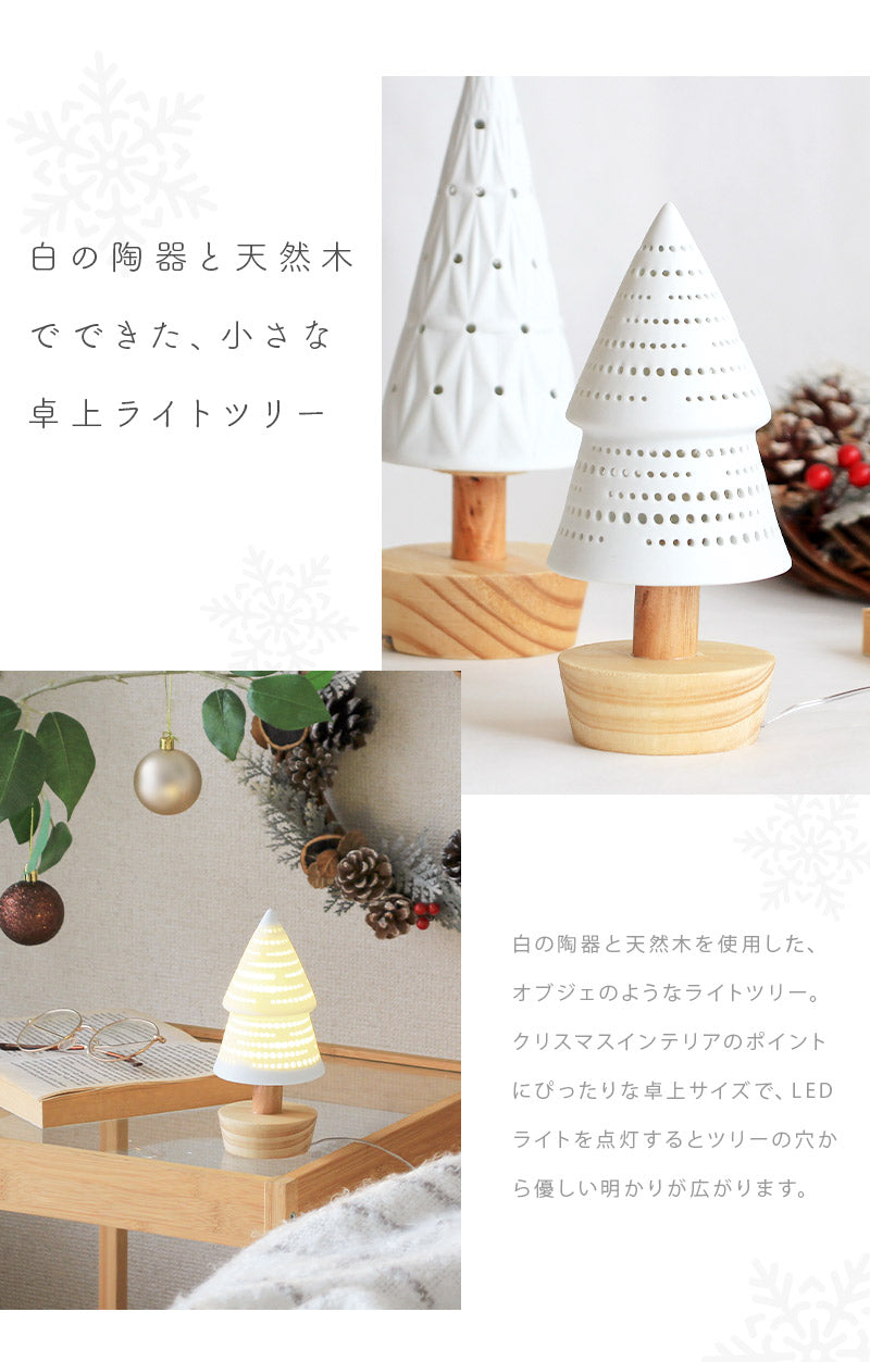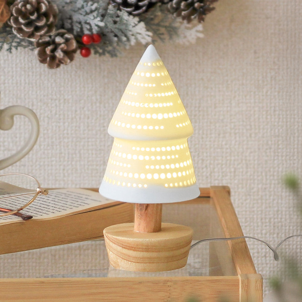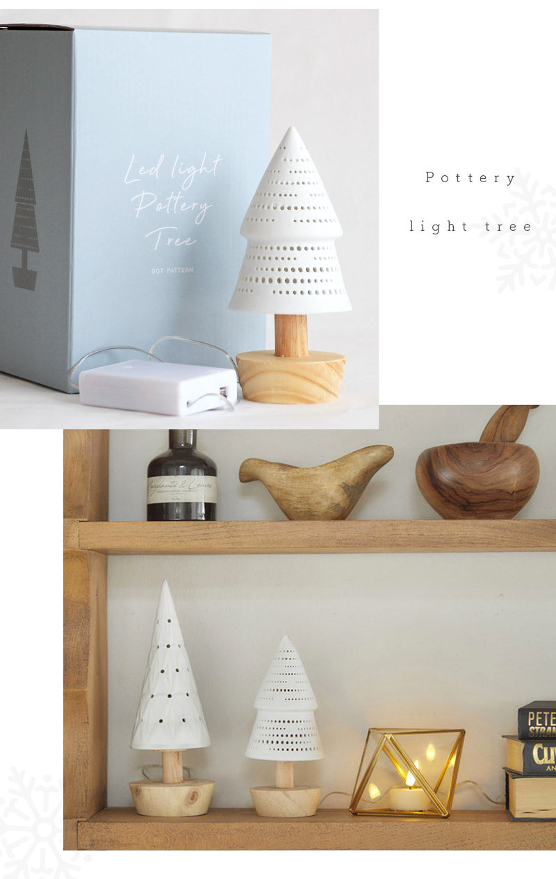 白の陶器と天然木を使用した、オブジェのようなライトツリー。クリスマスインテリアのポイントにぴったりな卓上サイズで、LEDライトを点灯するとツリーの穴から優しい明かりが広がります。陶器にはドットラインがあしらわれ、シンプルだけど存在感抜群♪冬らしい上品な雰囲気を楽しめます。6時間後に自動消灯、18時間後に自動点灯するルーティンタイマー機能付きなので、照明を付け放しでも安心◎インテリアに馴染みながらもクリスマス気分を上げてくれる、ほっこりナチュラルなツリーライトです。