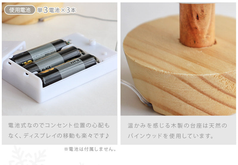 | 備考 | ●単3乾電池3本使用(電池は付属しません) ●連続点灯時間約30時間(電池の種類や使用環境、ご使用の頻度によって異なります。) ●タイマー付:6時間(6時間後に消灯、18時間後に点灯します) |