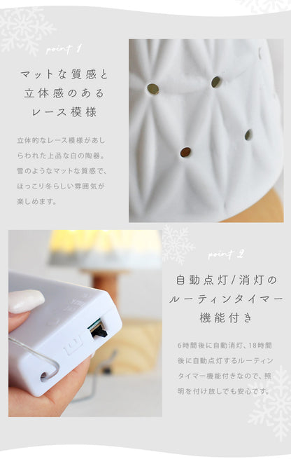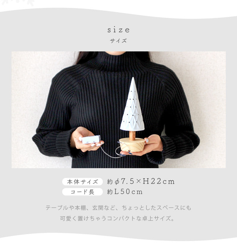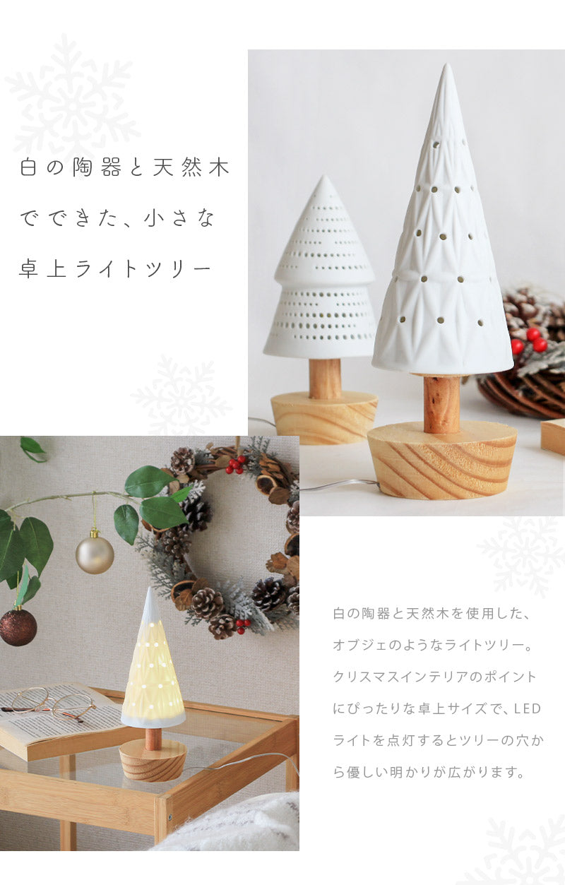 白の陶器と天然木を使用した、オブジェのようなライトツリー。クリスマスインテリアのポイントにぴったりな卓上サイズで、LEDライトを点灯するとツリーの穴から優しい明かりが広がります。陶器には立体的なレース模様があしらわれ、シンプルだけど存在感抜群♪冬らしい上品な雰囲気を楽しめます。6時間後に自動消灯、18時間後に自動点灯するルーティンタイマー機能付きなので、照明を付け放しでも安心◎インテリアに馴染みながらもクリスマス気分を上げてくれる、ほっこりナチュラルなツリーライトです。