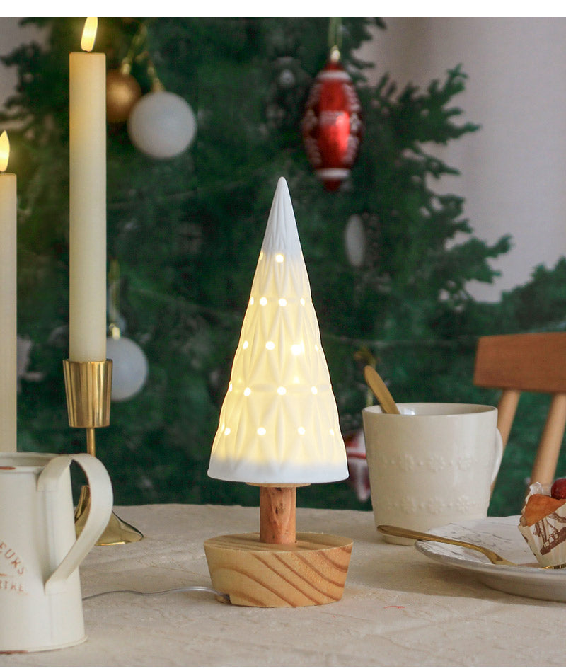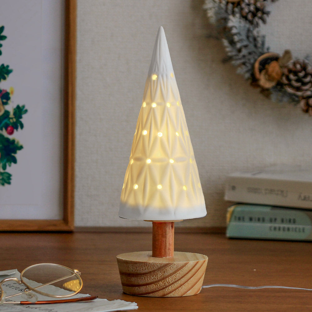 白の陶器と木でできた、小さな卓上ライトツリー