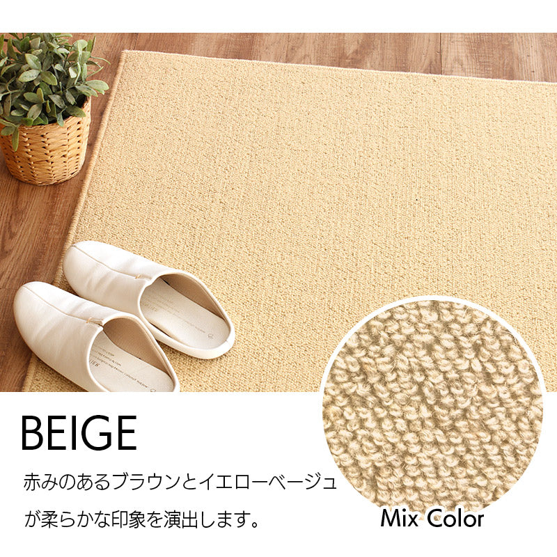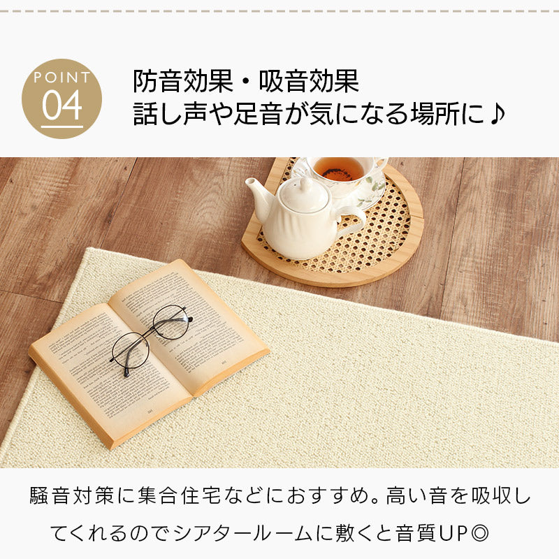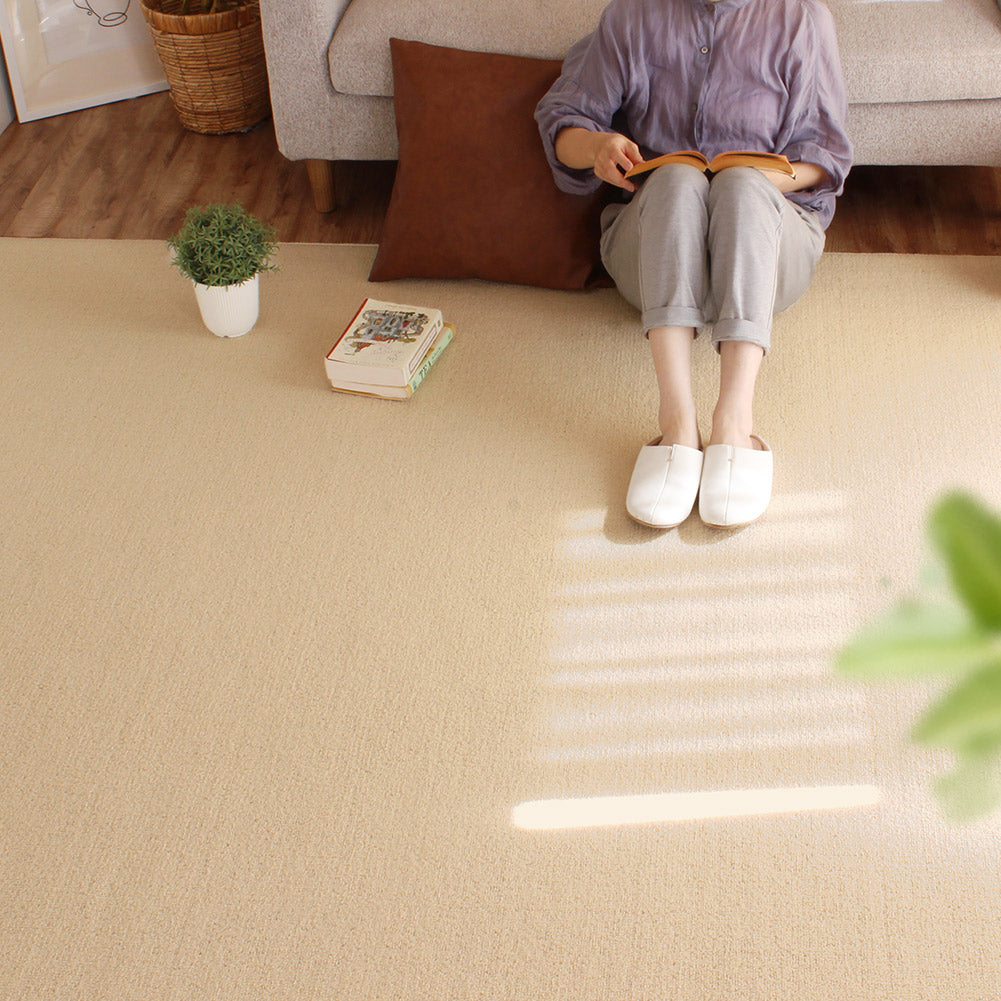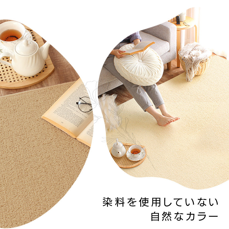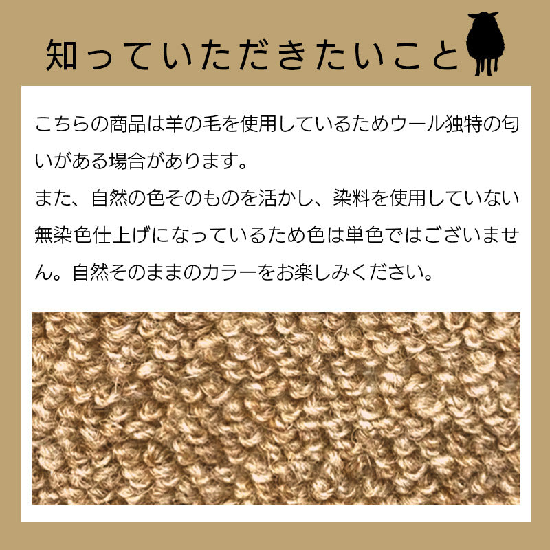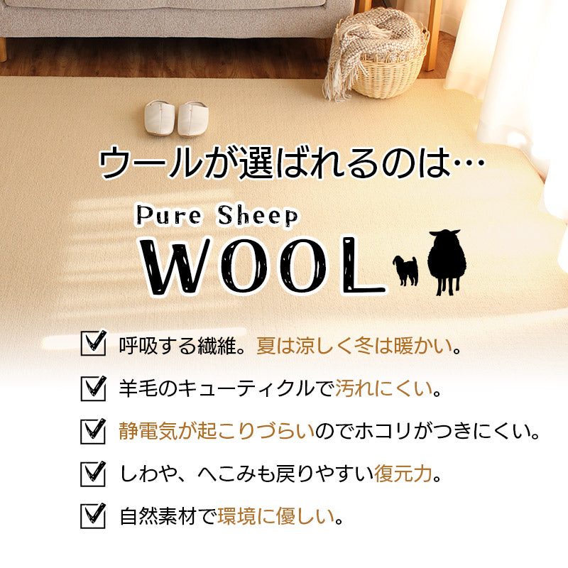 国内工場で丁寧に作られた日本製なので安心。「ピュアシープ」は、自然の色そのものを活かし、染料を使用していない無染色仕上げなので環境にやさしく、温かみを感じる贅沢なラグです。ウールは、呼吸する繊維なので夏は涼しく冬は暖かい。静電気が起こりづらいのでホコリがつきにくい。重い物を置いても戻る復元力、燃えにくい防炎効果、高い音を吸着する防音効果など天然ウールならではの様々な機能があります。そのうえ、防ダニ、抗菌など、安心してお使いいただける機能まで♪またハサミで切ってもほつれない生地なので、好みのサイズにカットOK♪柱や家具を避けてピッタリ敷き詰められます。
