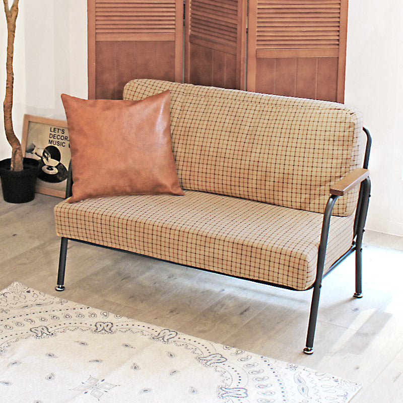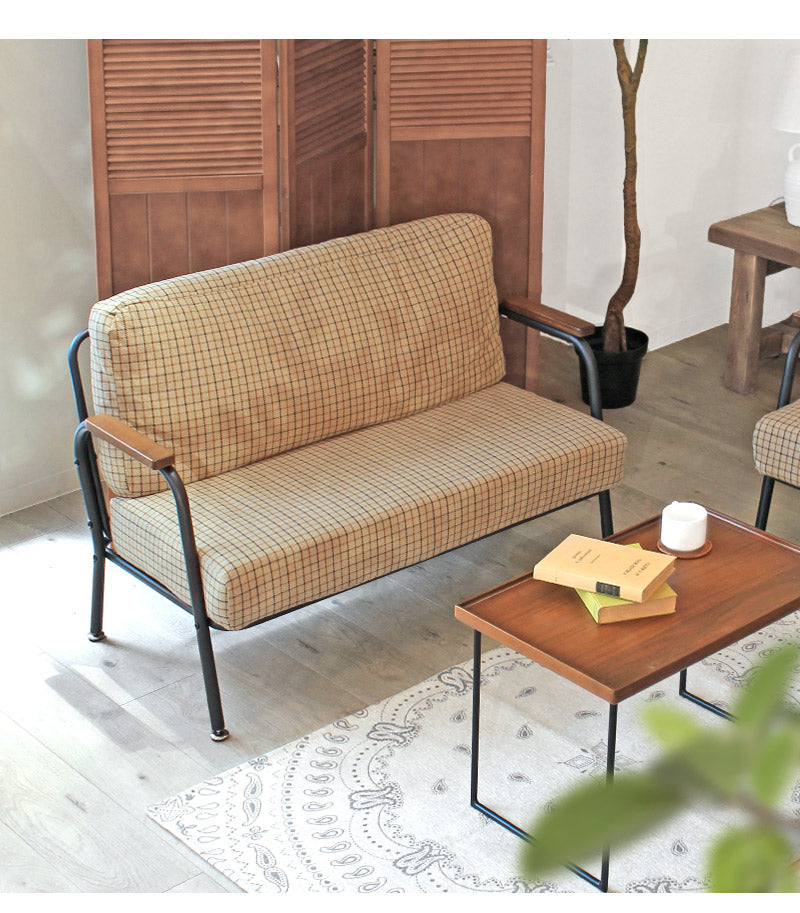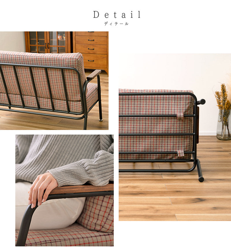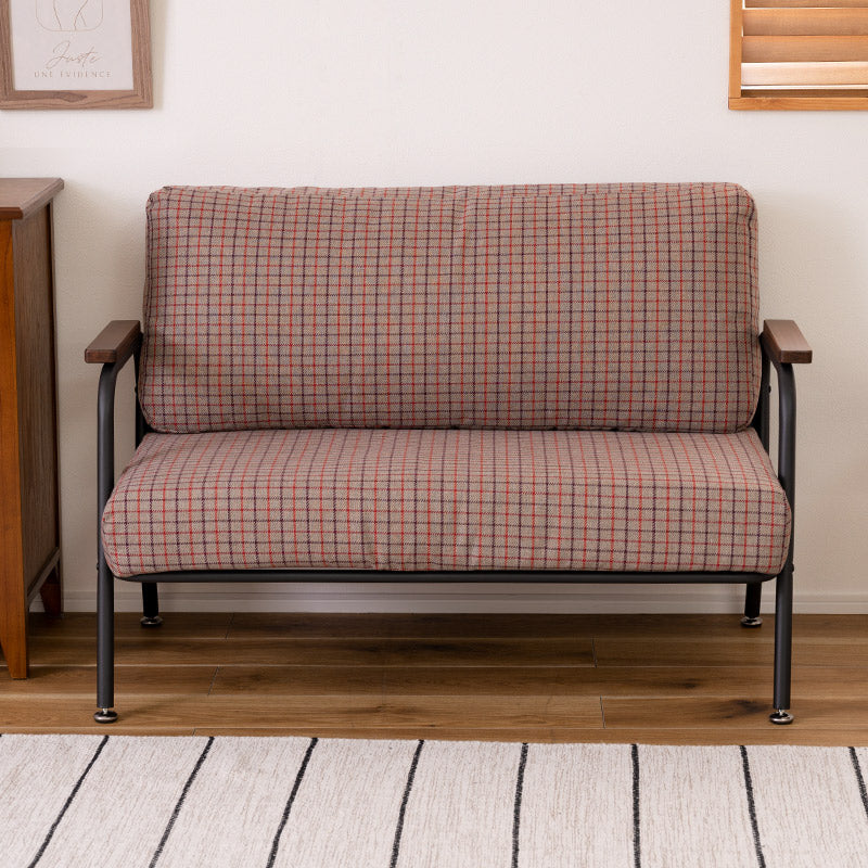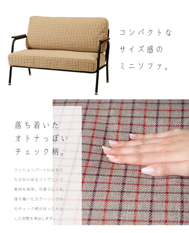 深めの座面とポケットコイルのクッション材で座り心地がとっても快適なミニソファ。クッションパーツにはあたたかみのあるファブリック素材を採用。可愛らしくも落ち着いたカラーリングのチェック柄がほっこりとした空間を演出します。ひじ掛けは手にしっくり馴染む木製素材を。ミニマルながらも長時間リラックスできる設計が嬉しい♪すっきりとしたスチールフレームで重たさを感じさせず、圧迫感なくスッキリとした印象になります。背もたれと座面のパーツはマジックテープで固定されているので簡単に取り外しが可能。隙間に溜まりがちな埃や小さなゴミのお掃除もお手軽にできて◎組み立ては付属の六角レンチでお手軽&簡単なので届いてすぐにお使いいただけます。一人掛けと二人掛けのセット使いもオススメです。