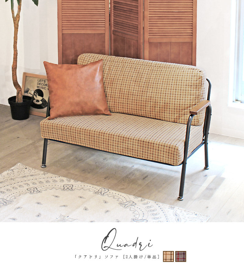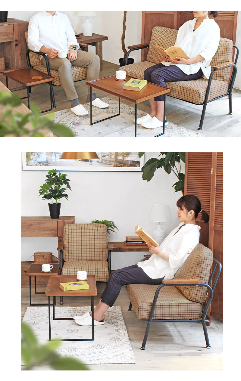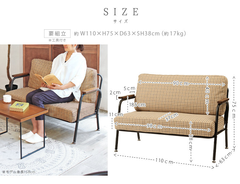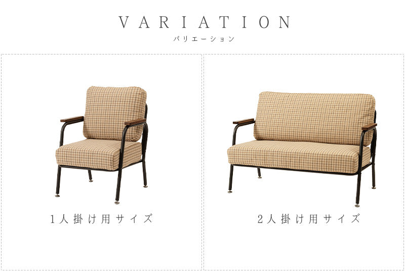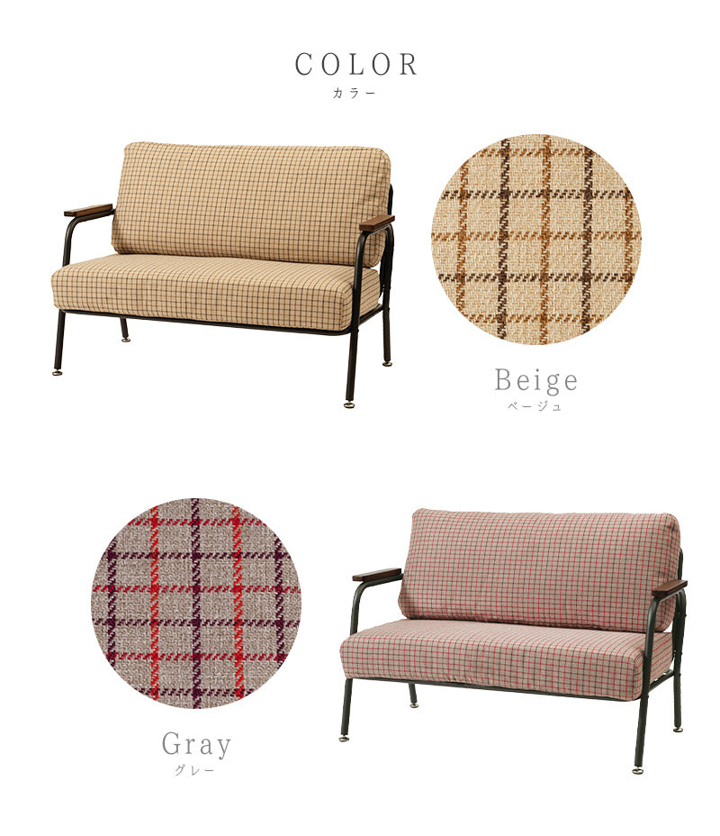 深めの座面とポケットコイルのクッション材で座り心地がとっても快適なミニソファ。クッションパーツにはあたたかみのあるファブリック素材を採用。可愛らしくも落ち着いたカラーリングのチェック柄がほっこりとした空間を演出します。ひじ掛けは手にしっくり馴染む木製素材を。ミニマルながらも長時間リラックスできる設計が嬉しい♪すっきりとしたスチールフレームで重たさを感じさせず、圧迫感なくスッキリとした印象になります。背もたれと座面のパーツはマジックテープで固定されているので簡単に取り外しが可能。隙間に溜まりがちな埃や小さなゴミのお掃除もお手軽にできて◎組み立ては付属の六角レンチでお手軽&簡単なので届いてすぐにお使いいただけます。一人掛けと二人掛けのセット使いもオススメです。