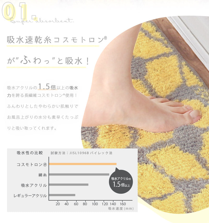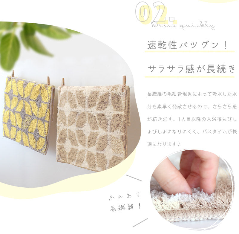 吸水アクリルの1.5倍以上の吸水力を誇る長繊維でお風呂上がりの水分をたっぷり吸収&速乾!
