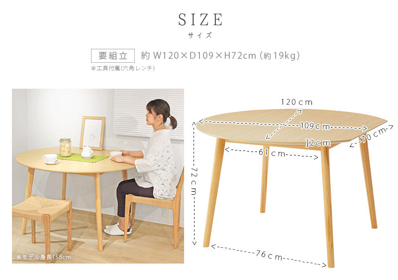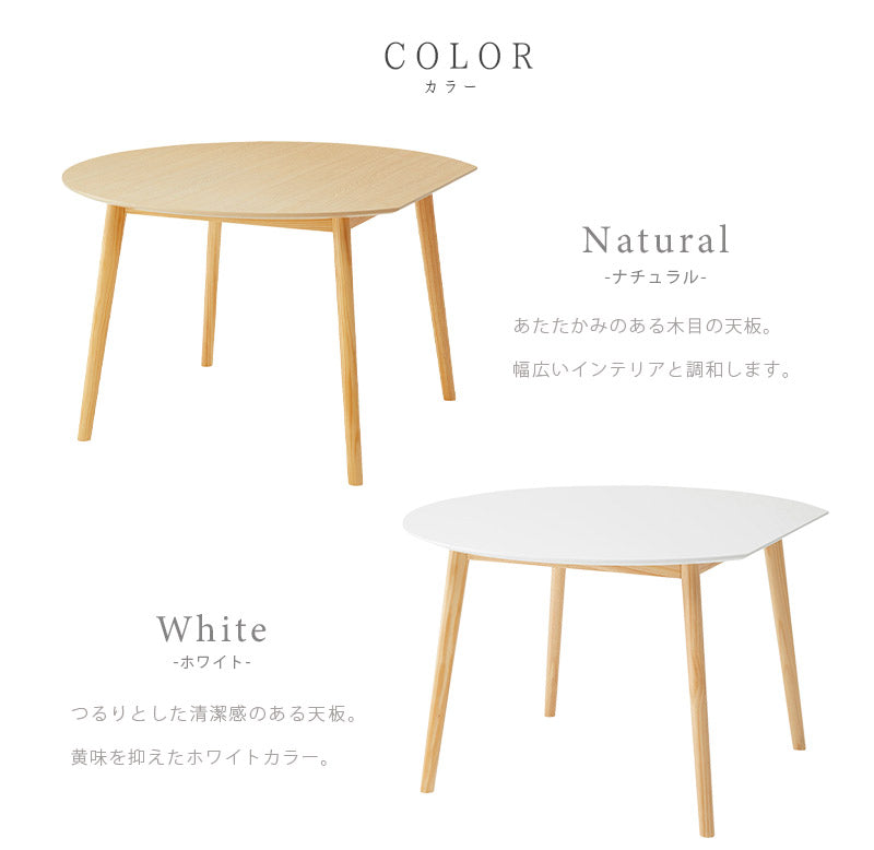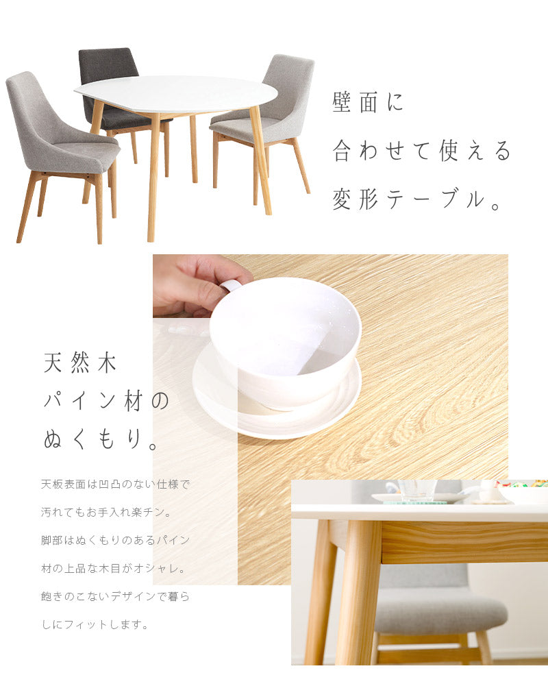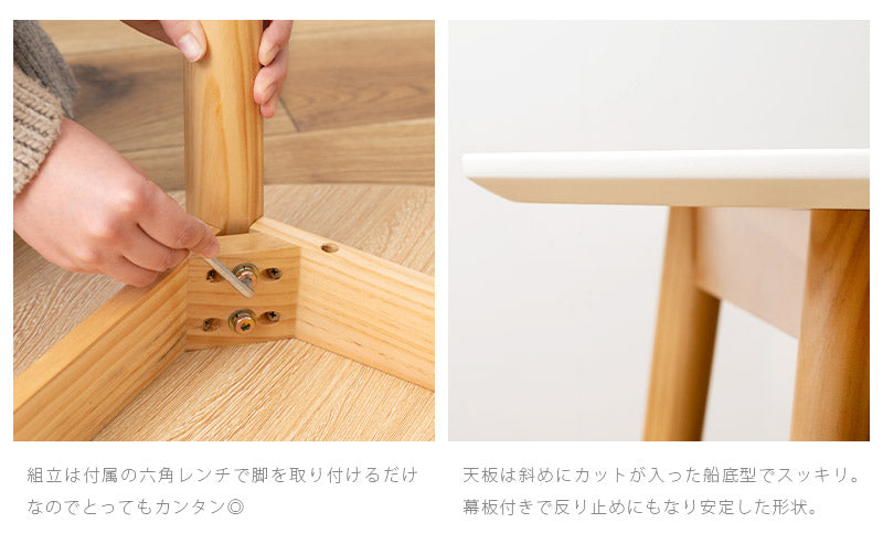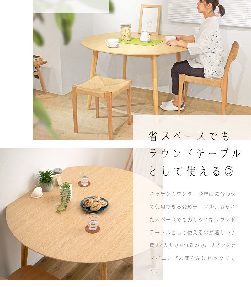 キッチンカウンターや壁面に合わせて使用できる変形テーブル。天板表面は凹凸のない仕様で汚れてもお手入れ楽チン。脚部はぬくもりのあるパイン材の上品な木目がオシャレ。飽きのこないデザインで暮らしにフィットします。限られたスペースでもおしゃれなラウンドテーブルとして使えるのが嬉しい♪最大4人まで座れるので、リビングやダイニングの団らんにピッタリです。組立は付属の六角レンチで脚を取り付けるだけなのでとってもカンタン◎天板は斜めにカットが入った船底型でスッキリしており、幕板付きで反り止めにもなり安定した形状です。