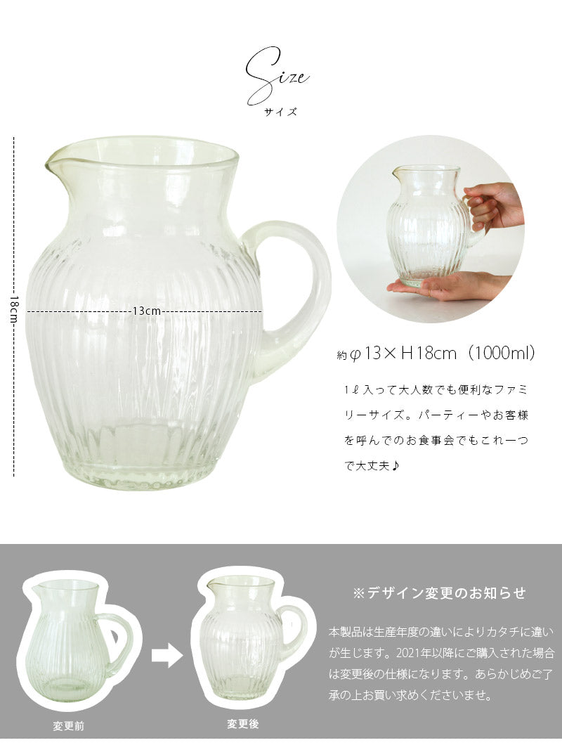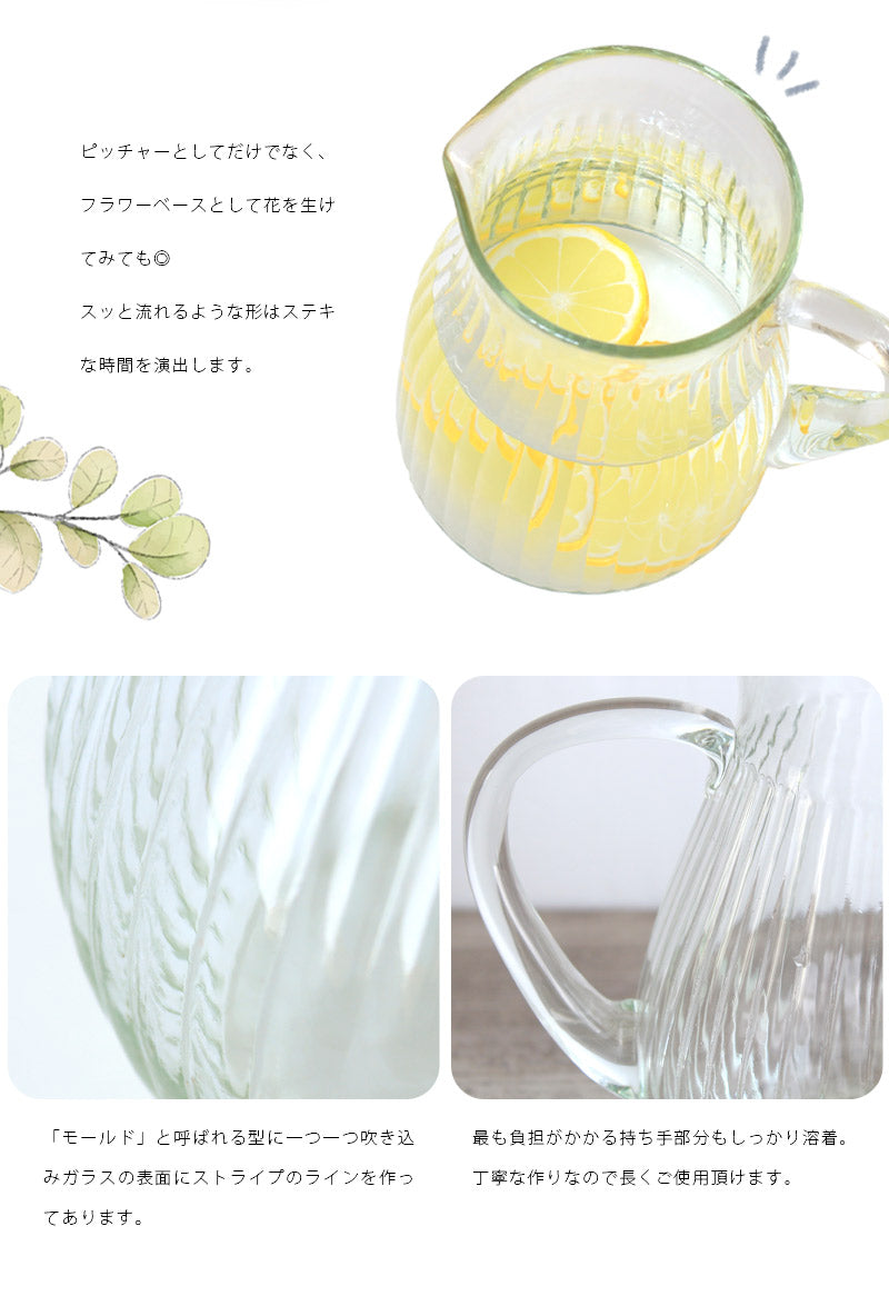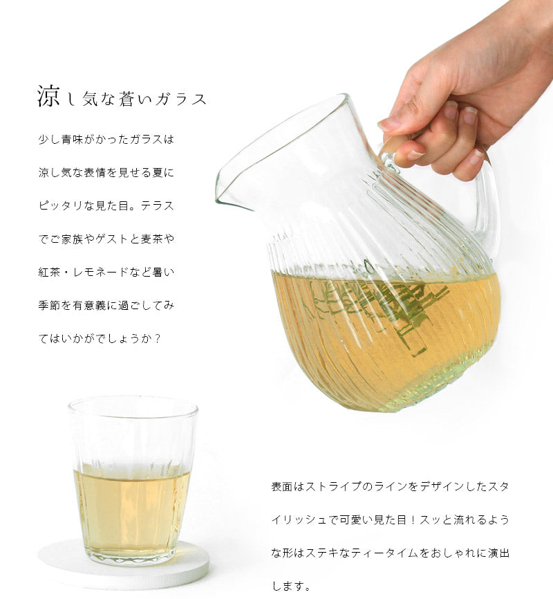 少し青味がかったガラスは涼し気な表情を見せる夏にピッタリな見た目。口が広くお手入れしやすいので、中にハーブやフルーツを入れてデトックスウォーターを作ってみたり、テラスでご家族やゲストと麦茶や紅茶・レモネードなど暑い季節を涼しげに演出してくれるガラスピッチャーはいかがでしょうか?ドリンクはもちろん、大きな花束を飾る花瓶代わりにしたりワイヤーライトを詰めてもオシャレ♪ちょっぴり懐かしさを感じるクラシカルなデザインです。
