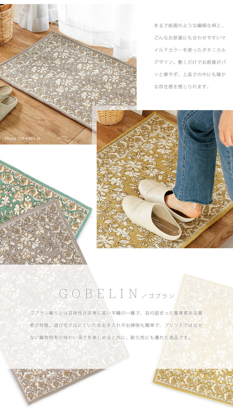 芸術性の高いクラシカルな風合いに、目の詰まった重厚感ある質感が魅力のゴブランシェニールマット。まるで絵画のような繊細かつ大胆な植物柄は、敷くだけでお部屋がパッと華やぎ、上品さの中にも確かな存在感を感じられます。生地にはしなやかでサラッとした触り心地のシェニール糸を使用し、遊び毛が出にくくお手入れやお掃除も簡単♪季節を問わず快適に使えて、耐久性にも優れた逸品です。