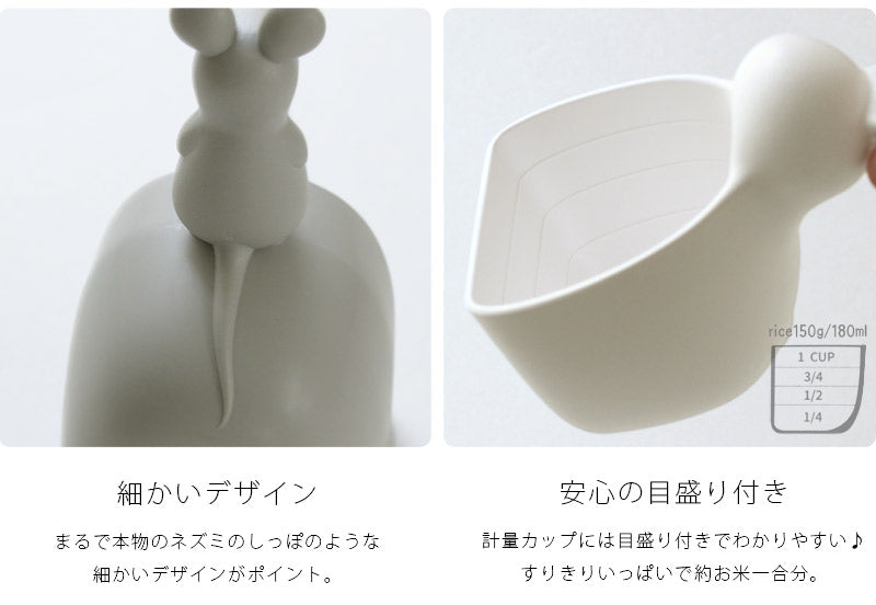 | サイズ | マウス:約W7cm×D6.5cm×H12.2cm ラビット:約W7cm×D6.5cm×H13.3cm お米:150g(1合)、容量:180ml |