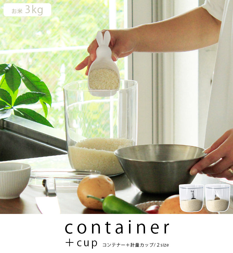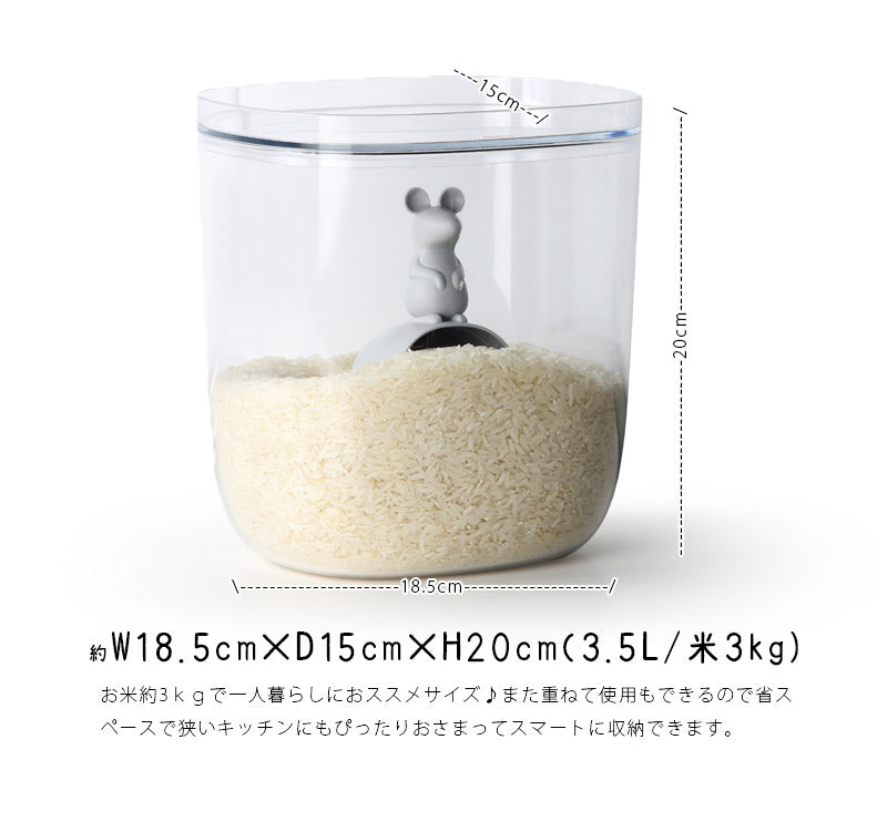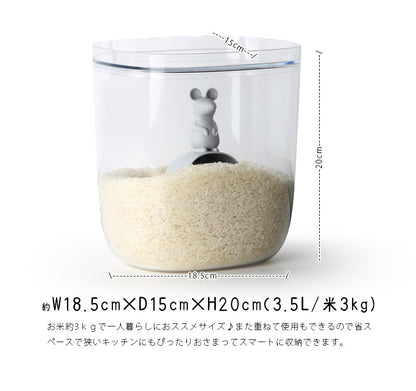 | サイズ | コンテナー本体: 容量:3.5L / お米3kg 約W18.5cm×D15cm×H20cm 計量カップ: 容量:180ml / お米150g(1合) マウス:約W7cm×D6.5cm×H12.2cm ラビット:約W7cm×D6.5cm×H13.3cm |