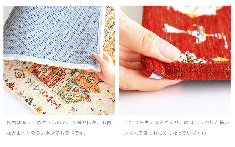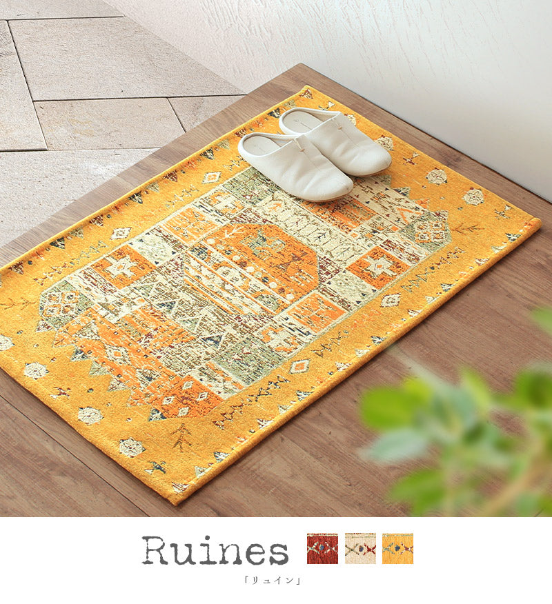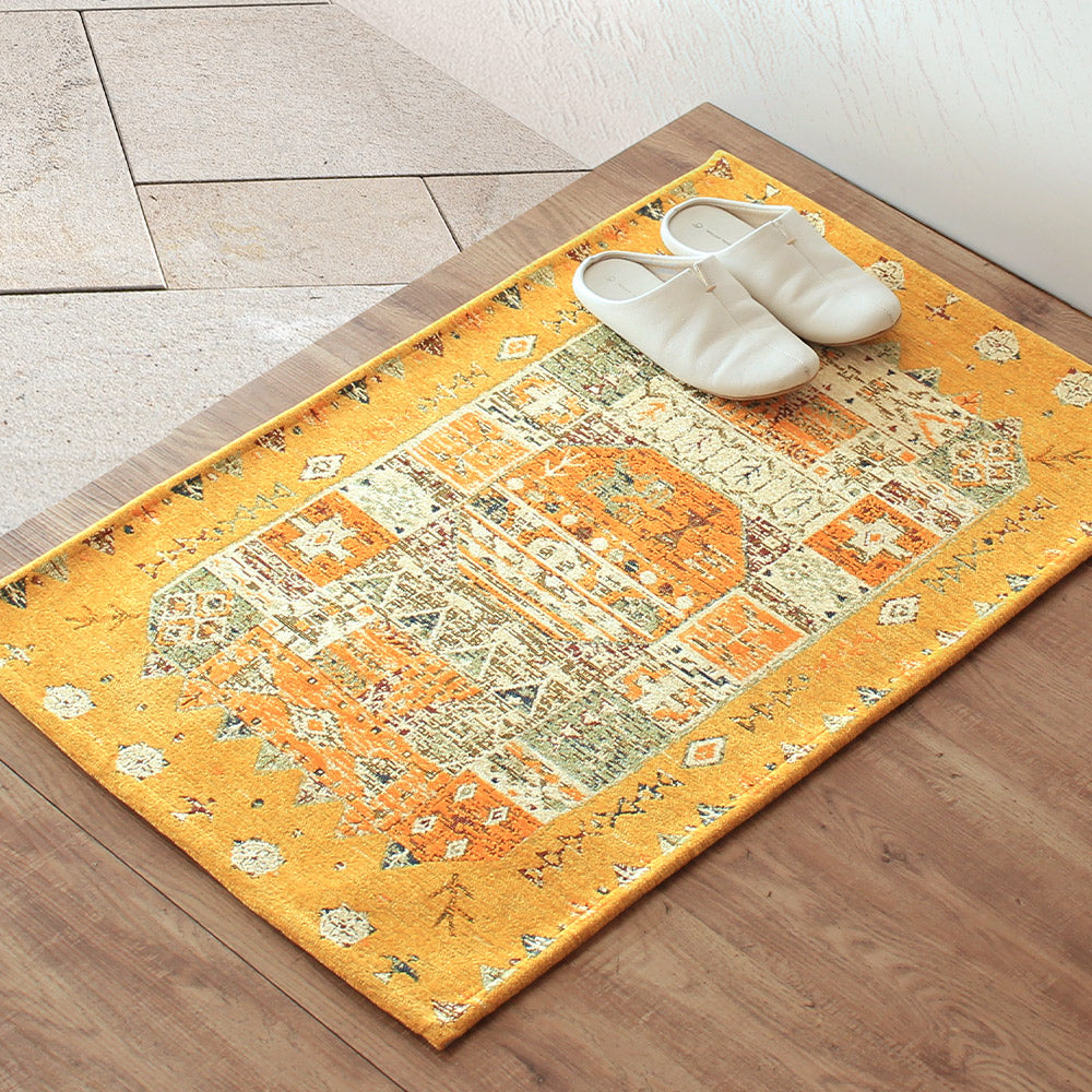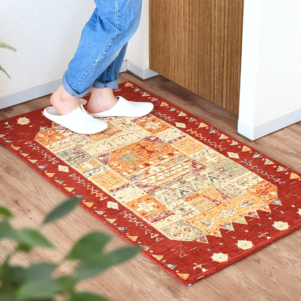 繊細な織り模様で、遊牧民による手織り絨毯「ギャッベ」をモチーフにしたほっこりと素朴ながら鮮やかな配色が目を惹くヴィンテージ調の玄関マット。滑らかな肌触りのシェニール糸を使用して織り上げた短毛の生地は、通気性が良くシーズンを問わず一年中サラッと快適な使い心地です。更に手洗いOKなので、うっかり汚してしまってもご家庭で丸洗いできていつでも清潔◎お部屋全体の印象が華やぎ、こなれ感の出せる一枚です。