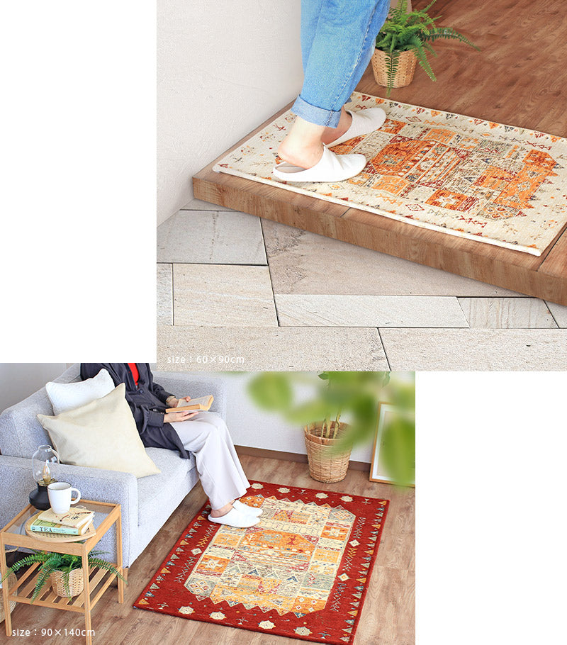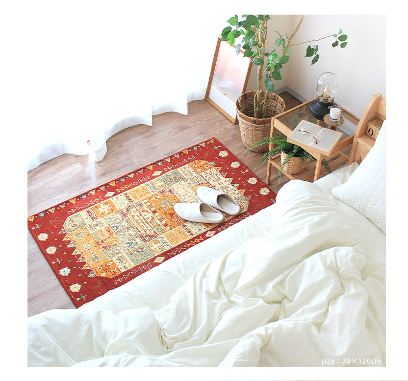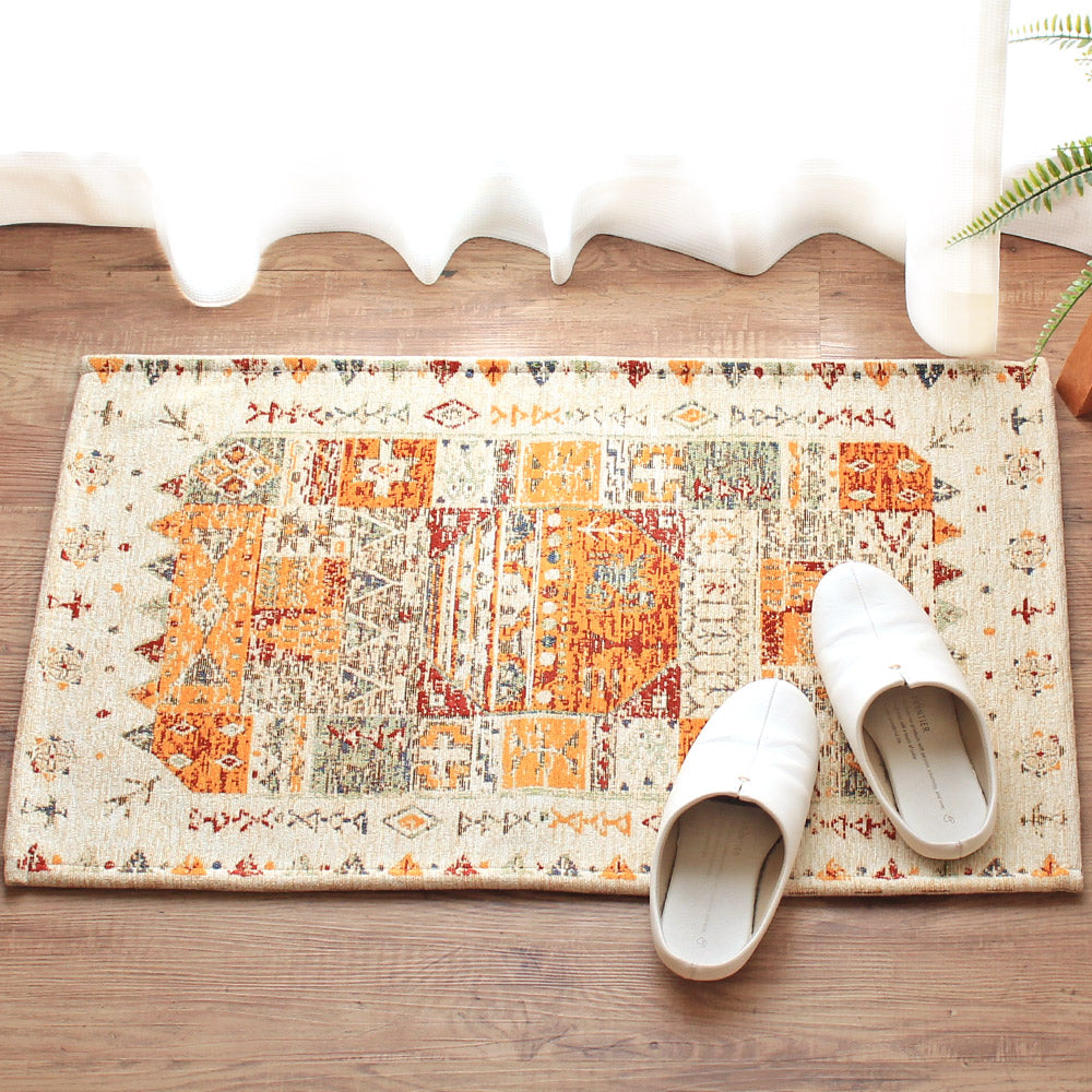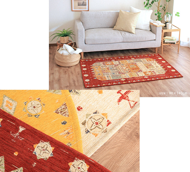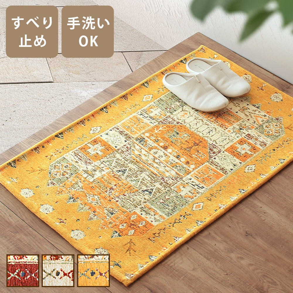 繊細な織り模様で、遊牧民による手織り絨毯「ギャッベ」をモチーフにしたほっこりと素朴ながら鮮やかな配色が目を惹くヴィンテージ調の玄関マット。滑らかな肌触りのシェニール糸を使用して織り上げた短毛の生地は、通気性が良くシーズンを問わず一年中サラッと快適な使い心地です。更に手洗いOKなので、うっかり汚してしまってもご家庭で丸洗いできていつでも清潔◎お部屋全体の印象が華やぎ、こなれ感の出せる一枚です。