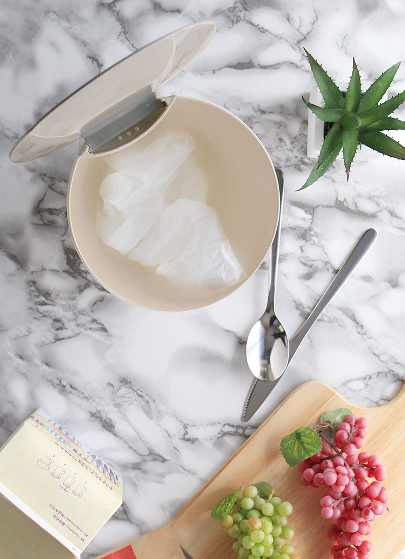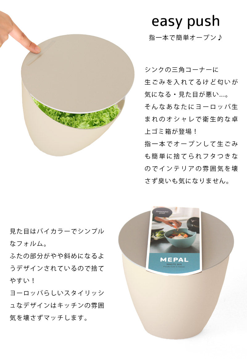 シンクの三角コーナーに生ごみを入れてるけど匂いが気になるし見た目が最悪...。そんな悩みを解決してくれるヨーロッパ生まれのオシャレで衛生的な卓上ゴミ箱が登場!指一本でサッとオープンするから生ごみを簡単に捨てられます♪フタつきなのでスッキリきれいなキッチンをキープし、嫌な臭いを軽減してくれます。