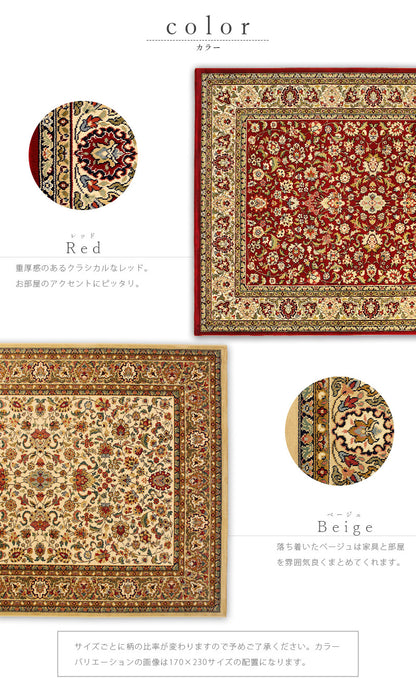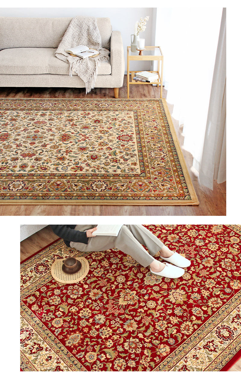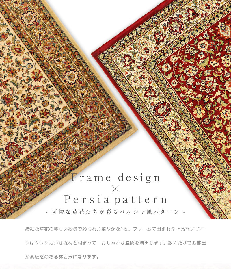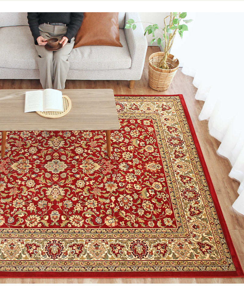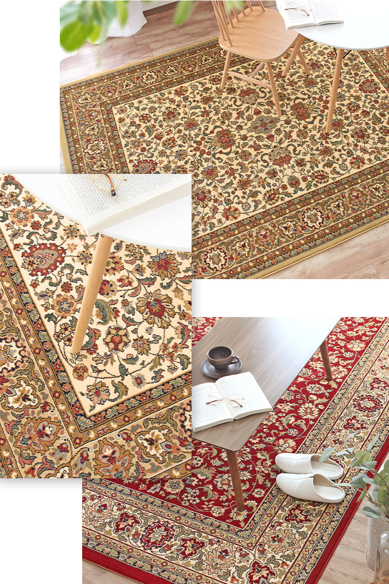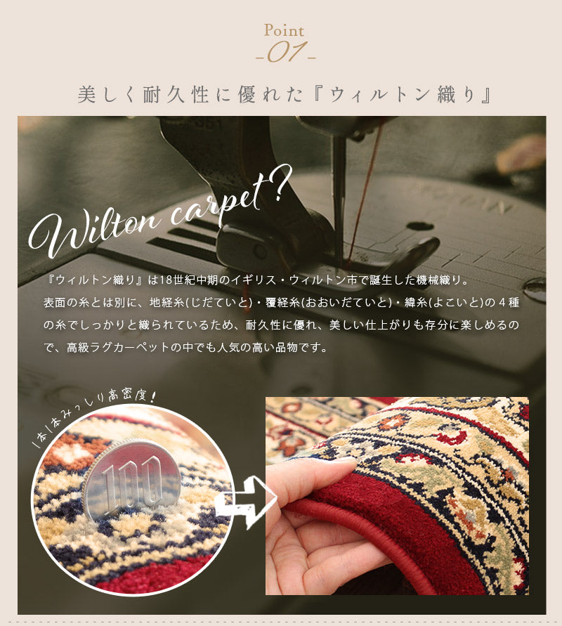 繊細な草花の美しい紋様で彩られた華やかな1枚。フレームで囲まれた上品なデザインはクラシカルな総柄と相まって、おしゃれな空間を演出します。敷くだけでお部屋が高級感のある雰囲気になります。『ウィルトン織り』は18世紀中期のイギリス・ウィルトン市で誕生した機械織りで、表面の模様を作るものとは別に地経糸(じだていと)・覆経糸(おおいだていと)・緯糸(よこいと)の4種の糸でしっかりと織られているため、優れた耐久性と美しい織り模様が楽しめます。