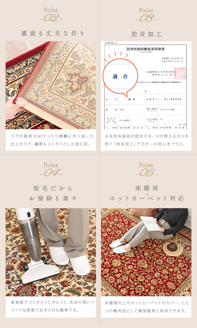 | 備考 | ●防炎加工 ●床暖・ホットカーペット対応 ※すべり止め加工等はされておりません。フローリング等に敷いて使用する場合には、市販のすべり止めシートをご利用ください。 |