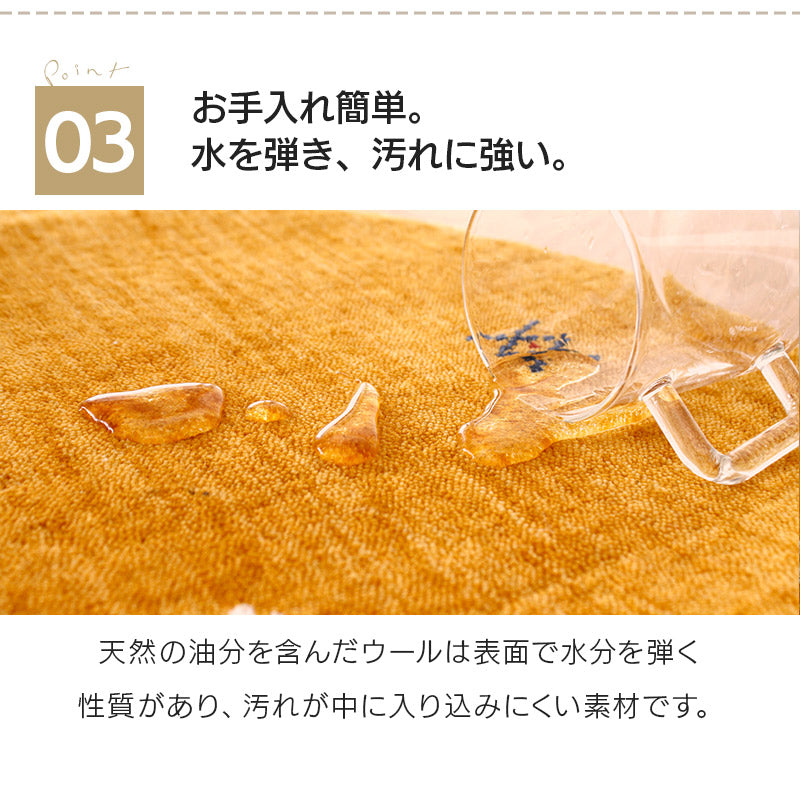 天然の油分を含んだウールは表面で水分を弾く性質があり、汚れが中に入り込みにくい素材です。